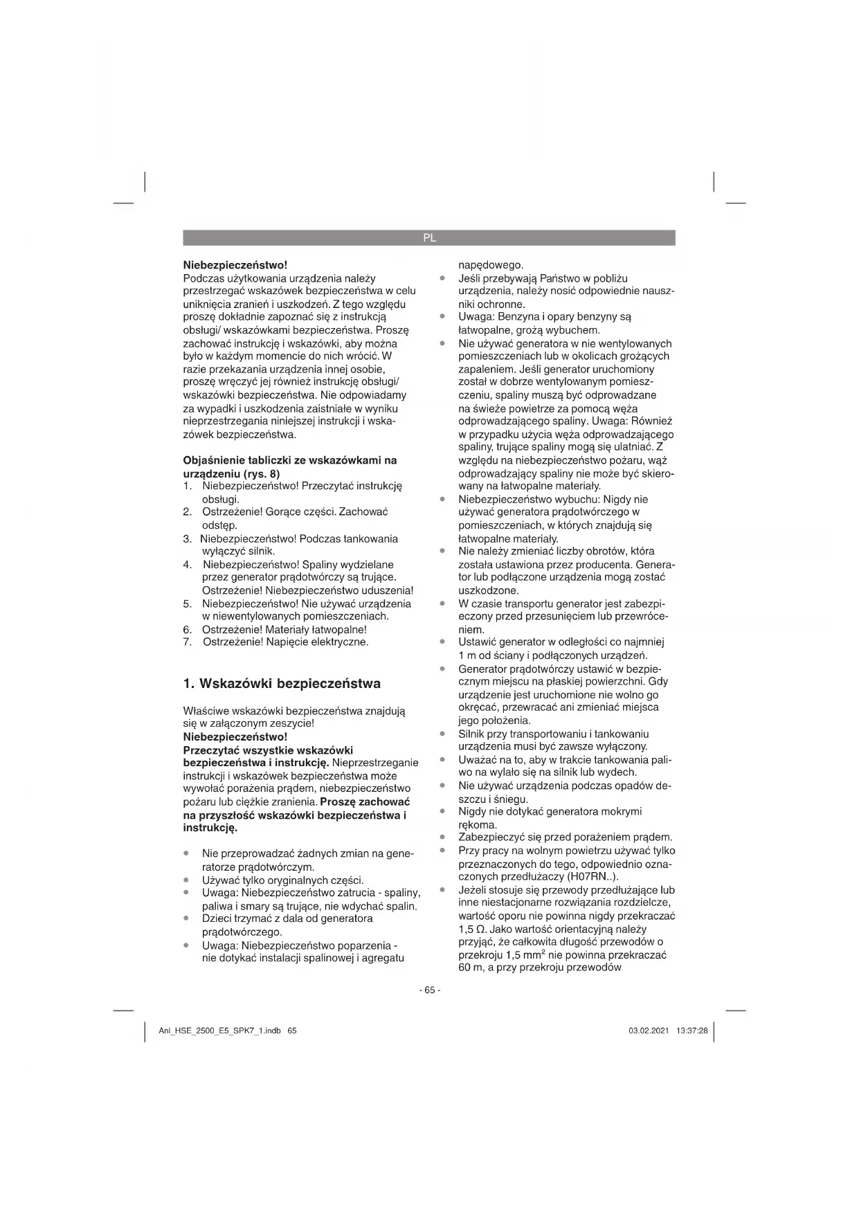 Nie podłączać generatora do sieci gospo- darstwa domowego; może to spowodować uszkodzenie generatora lub innych urządzeń elektrycznych w sieci. Wskazówka: Niektóre urządzenia elektryczne (wyrzynarki elektryczne, wiertarki udarowe itd.) podczas pracy w utrudnionych warunkach mogą mieć wyższy pobór prądu. Anl_HSE_2500_E5_SPK7_1.indb 68Anl_HSE_2500_E5_SPK7_1.indb 68 03.02.2021 13:37:2903.02.2021 13:37:29PL