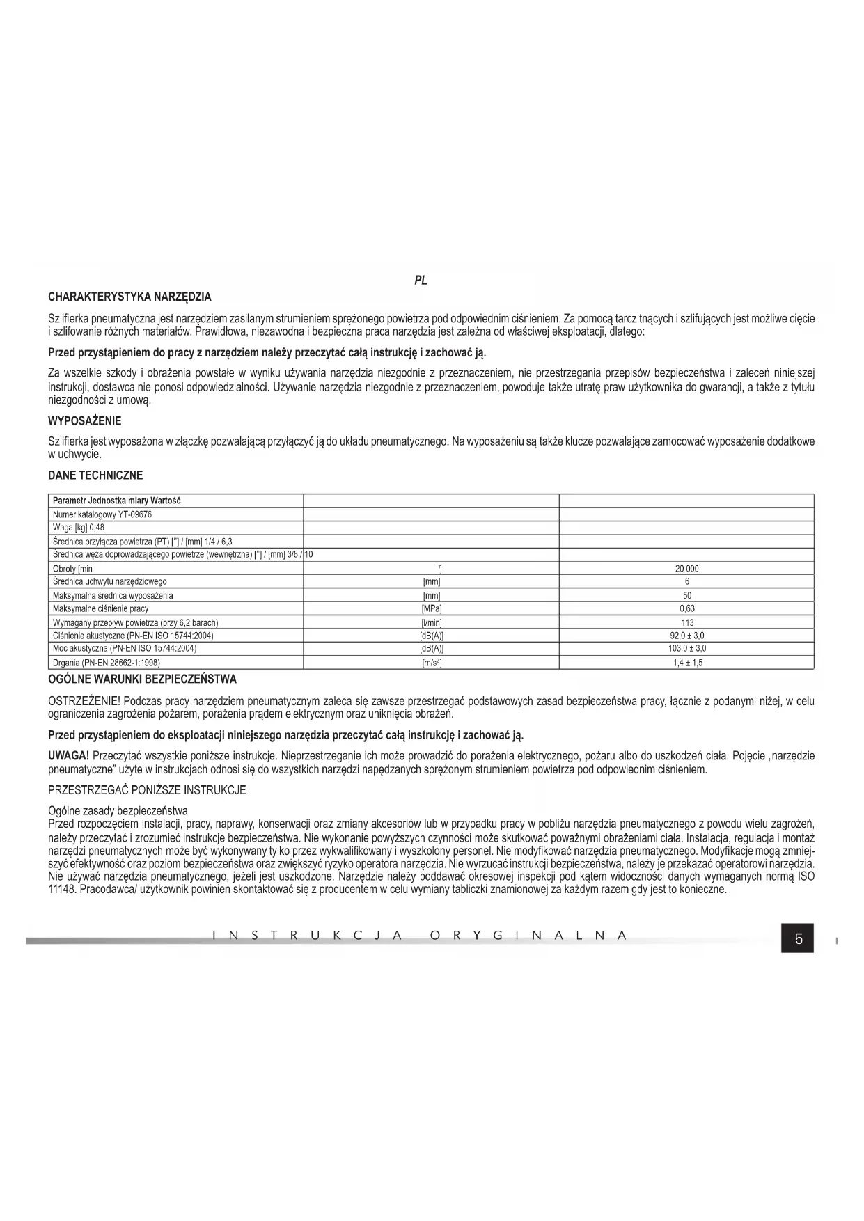 Szlifi erka pneumatyczna jest narzędziem zasilanym strumieniem sprężonego powietrza pod odpowiednim ciśnieniem. Za pomocą tarcz tnących i szlifujących jest możliwe cięcie i szlifowanie różnych materiałów. Prawidłowa, niezawodna i bezpieczna praca narzędzia jest zależna od właściwej eksploatacji, dlatego: Przed przystąpieniem do pracy z narzędziem należy przeczytać całą instrukcję i zachować ją. Za wszelkie szkody i obrażenia powstałe w wyniku używania narzędzia niezgodnie z przeznaczeniem, nie przestrzegania przepisów bezpieczeństwa i zaleceń niniejszej instrukcji, dostawca nie ponosi odpowiedzialności. Używanie narzędzia niezgodnie z przeznaczeniem, powoduje także utratę praw użytkownika do gwarancji, a także z tytułu niezgodności z umową. WYPOSAŻENIE Szlifi erka jest wyposażona w złączkę pozwalającą przyłączyć ją do układu pneumatycznego. Na wyposażeniu są także klucze pozwalające zamocować wyposażenie dodatkowe w uchwycie. DANE TECHNICZNE Parametr Jednostka miary Wartość Numer katalogowy YT-09676 Waga [kg] 0,48 Średnica przyłącza powietrza (PT) [‘’] / [mm] 1/4 / 6,3 Średnica węża doprowadzającego powietrze (wewnętrzna) [‘’] / [mm] 3/8 / 10 Obroty [min