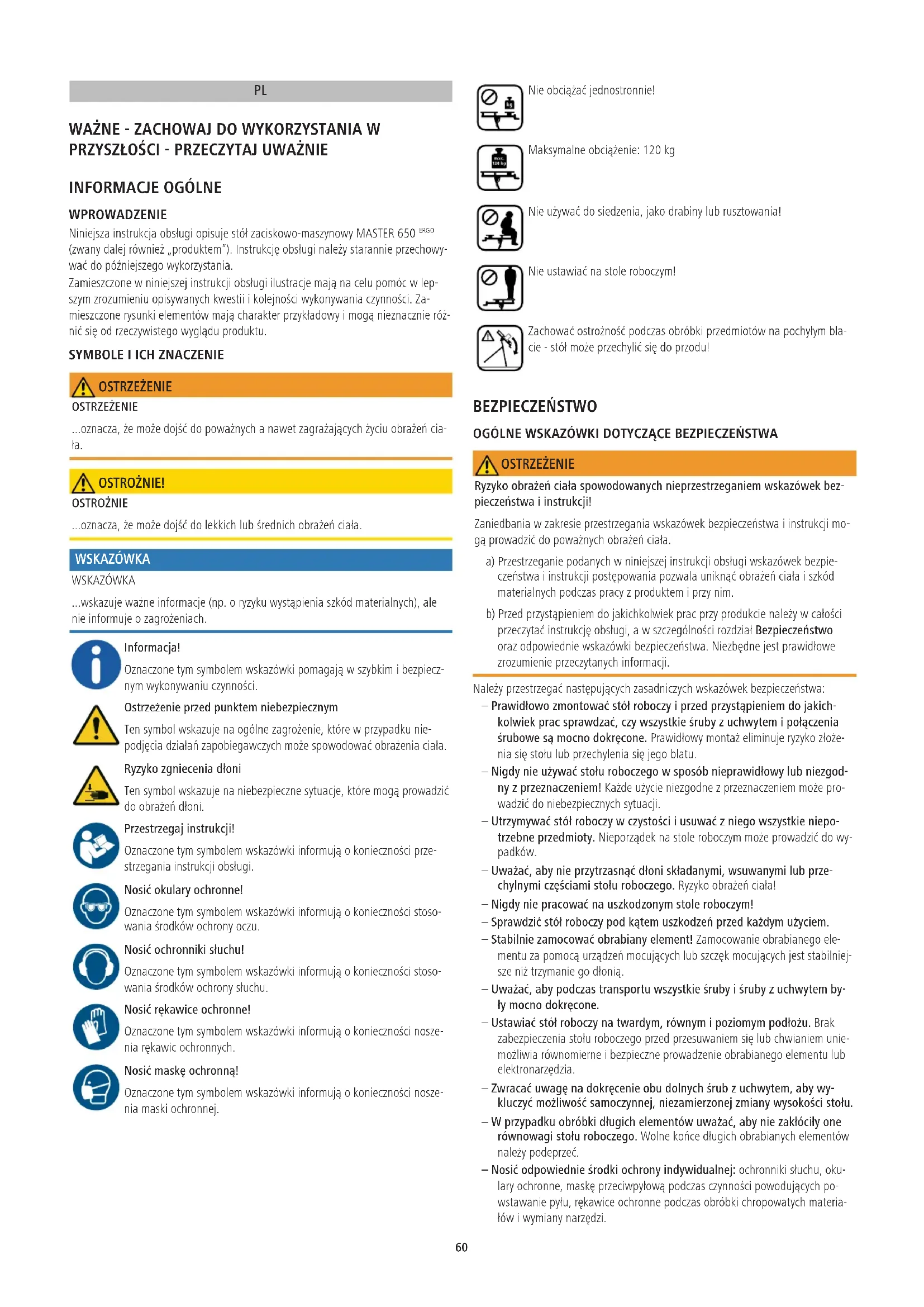 Stół MASTER650 ERGO można wykorzystywać do następujących celów: – Jako stół zaciskowy i maszynowy do obróbki elementów (np. wiercenia, szlifo- wania itd.). – Do mocowania obrabianych elementów pomiędzy płytami blatu. – Do mocowania większych obrabianych elementów za pomocą zamontowa- nych na stole roboczym dodatkowych szczęk zaciskowych z tworzywa sztucz- nego. MOŻLIWE DO PRZEWIDZENIA NIEWŁAŚCIWE UŻYCIE Każde użycie wykraczające poza opisane w rozdziale „Użytkowanie zgodne z prze- znaczeniem” jest uważane za możliwe do przewidzenia niewłaściwe użycie. Obej- muje to np.: – Nieprzestrzeganie wskazówek bezpieczeństwa dotyczących tego produktu lub zamontowanego narzędzia. – Wykorzystywanie jako stołu lub stojaka maszynowego. – Wykorzystywanie jako platformy roboczej lub do siadania. – Obciążanie powyżej 120kg. – Mocowanie długich, wystających z jednej strony obrabianych elementów bez odpowiedniego podparcia, mogące spowodować przewrócenie się stołu robo- czego na skutek przesunięcia się jego środka ciężkości na zewnątrz. Producent nie ponosi żadnej odpowiedzialności za szkody materialne i/lub osobowe powstałe w wyniku możliwego do przewidzenia niewłaściwego użycia oraz nieprze- strzegania instrukcji obsługi.