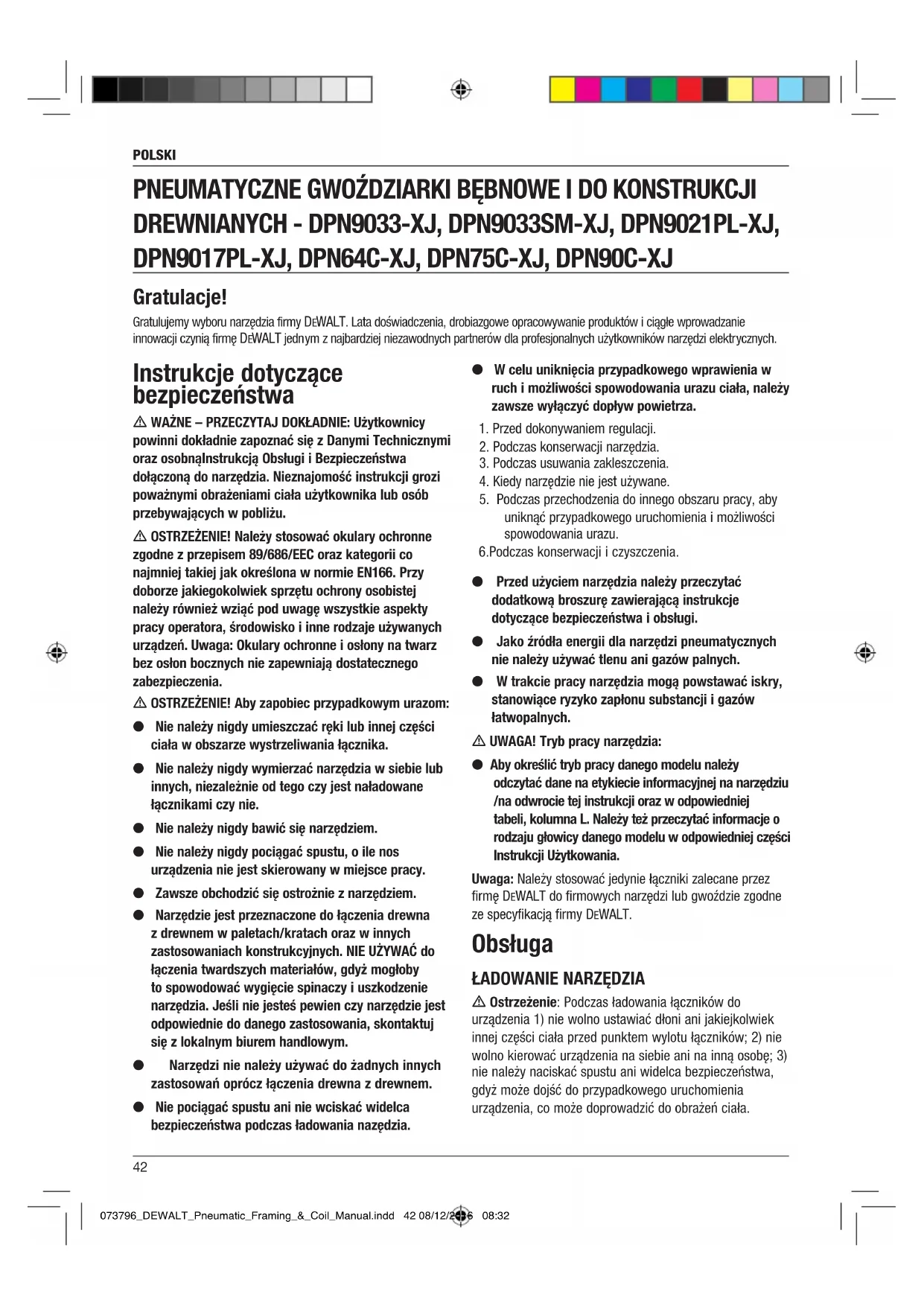 m Ostrzeżenie: Podczas ładowania łączników do urządzenia 1) nie wolno ustawiać dłoni ani jakiejkolwiek innej części ciała przed punktem wylotu łączników; 2) nie wolno kierować urządzenia na siebie ani na inną osobę; 3) nie należy naciskać spustu ani widelca bezpieczeństwa, gdyż może dojść do przypadkowego uruchomienia urządzenia, co może doprowadzić do obrażeń ciała. PNEUMATYCZNE GWOŹDZIARKI BĘBNOWE I DO KONSTRUKCJI DREWNIANYCH - DPN9033-XJ, DPN9033SM-XJ, DPN9021PL-XJ, DPN9017PL-XJ, DPN64C-XJ, DPN75C-XJ, DPN90C-XJ Gratulacje! Gratulujemy wyboru narzędzia firmy DEWALT. Lata doświadczenia, drobiazgowe opracowywanie produktów i ciągłe wprowadzanie innowacji czynią firmę DEWALT jednym z najbardziej niezawodnych partnerów dla profesjonalnych użytkowników narzędzi elektrycznych. 073796_DEWALT_Pneumatic_Framing_&_Coil_Manual.indd 42 08/12/2016 08:32POLSKI