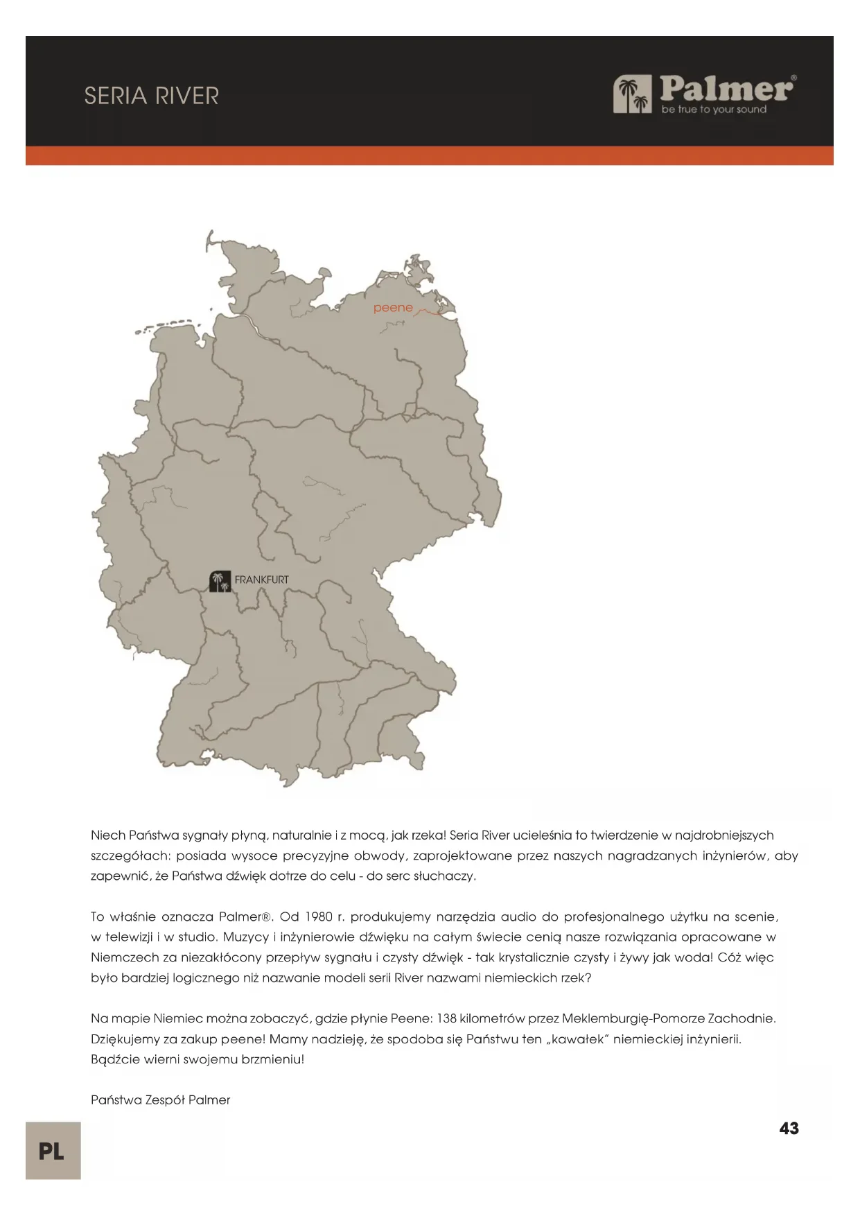 Niech Państwa sygnały płyną, naturalnie i z mocą, jak rzeka! Seria River ucieleśnia to twierdzenie w najdrobniejszych szczegółach: posiada wysoce precyzyjne obwody, zaprojektowane przez naszych nagradzanych inżynierów, aby zapewnić, że Państwa dźwięk dotrze do celu - do serc słuchaczy. To właśnie oznacza Palmer®. Od 1980 r. produkujemy narzędzia audio do profesjonalnego użytku na scenie, w telewizji i w studio. Muzycy i inżynierowie dźwięku na całym świecie cenią nasze rozwiązania opracowane w Niemczech za niezakłócony przepływ sygnału i czysty dźwięk - tak krystalicznie czysty i żywy jak woda! Cóż więc było bardziej logicznego niż nazwanie modeli serii River nazwami niemieckich rzek? Na mapie Niemiec można zobaczyć, gdzie płynie Peene: 138 kilometrów przez Meklemburgię-Pomorze Zachodnie. Dziękujemy za zakup peene! Mamy nadzieję, że spodoba się Państwu ten „kawałek” niemieckiej inżynierii. Bądźcie wierni swojemu brzmieniu! Państwa Zespół Palmer44 peene