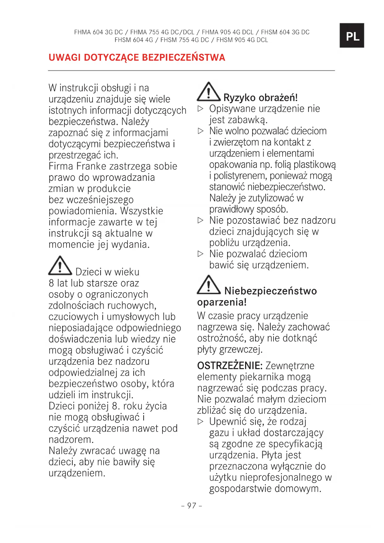 Nie przechowywać przedmiotów na powierzchniach przeznaczonych do gotowania. OSTRZEŻENIE: Pozostawianie żywności gotowanej na płycie bez nadzoru lub wtrybie automatycznym przy użyciu tłuszczu lub oleju jest niebezpieczne imoże prowadzić do pożaru. Rozgrzany olej łatwo ulega zapłonowi.FHMA 604 3G DC / FHMA 755 4G DC/DCL / FHMA 905 4G DCL / FHSM 604 3G DC FHSM 604 4G / FHSM 755 4G DC / FHSM 905 4G DCL – 100 –