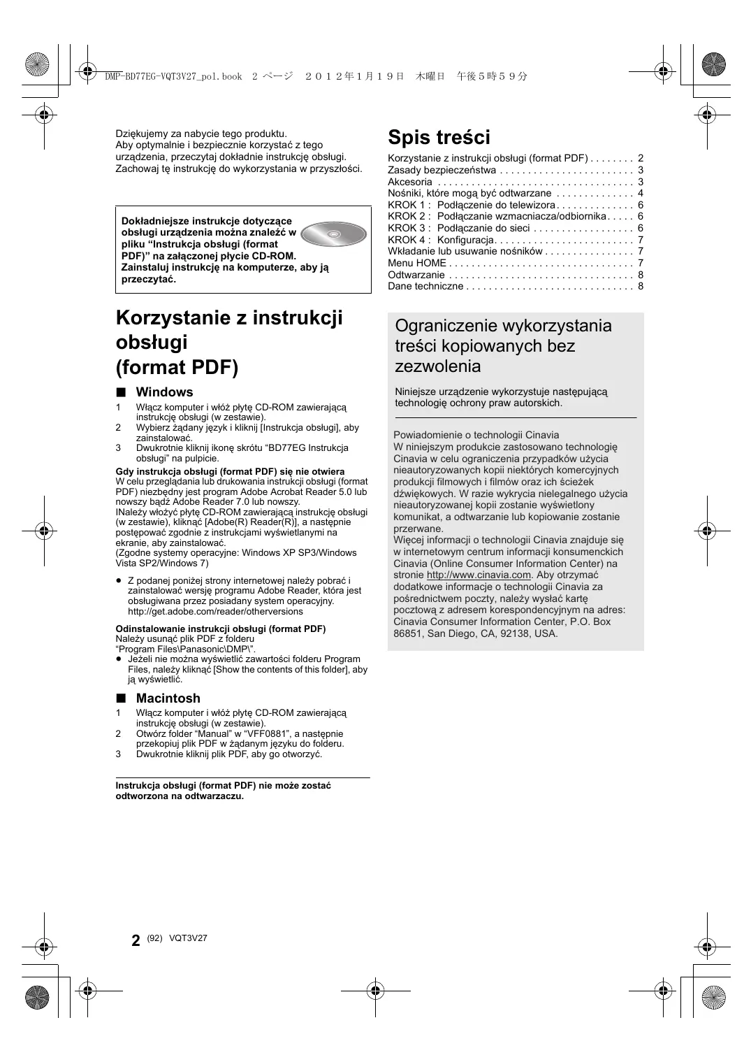 Spis treści Korzystanie z instrukcji obsługi (format PDF) . . . . . . . . Zasady bezpieczeństwa . . . . . . . . . . . . . . . . . . . . . . . . Akcesoria . . . . . . . . . . . . . . . . . . . . . . . . . . . . . . . . . . . Nośniki, które mogą być odtwarzane . . . . . . . . . . . . . . KROK 1 : Podłączenie do telewizora . . . . . . . . . . . . . . KROK 2 : Podłączanie wzmacniacza/odbiornika. . . . . KROK 3 : Podłączanie do sieci . . . . . . . . . . . . . . . . . . KROK 4 : Konfiguracja. . . . . . . . . . . . . . . . . . . . . . . . . Wkładanie lub usuwanie nośników . . . . . . . . . . . . . . . . Menu HOME . . . . . . . . . . . . . . . . . . . . . . . . . . . . . . . . . Odtwarzanie . . . . . . . . . . . . . . . . . . . . . . . . . . . . . . . . . Dane techniczne . . . . . . . . . . . . . . . . . . . . . . . . . . . . . . Korzystanie z instrukcji obsługi (format PDF) Ograniczenie wykorzystania treści kopiowanych bez zezwolenia ∫ Windows Niniejsze urządzenie wykorzystuje następującą technologię ochrony praw autorskich.