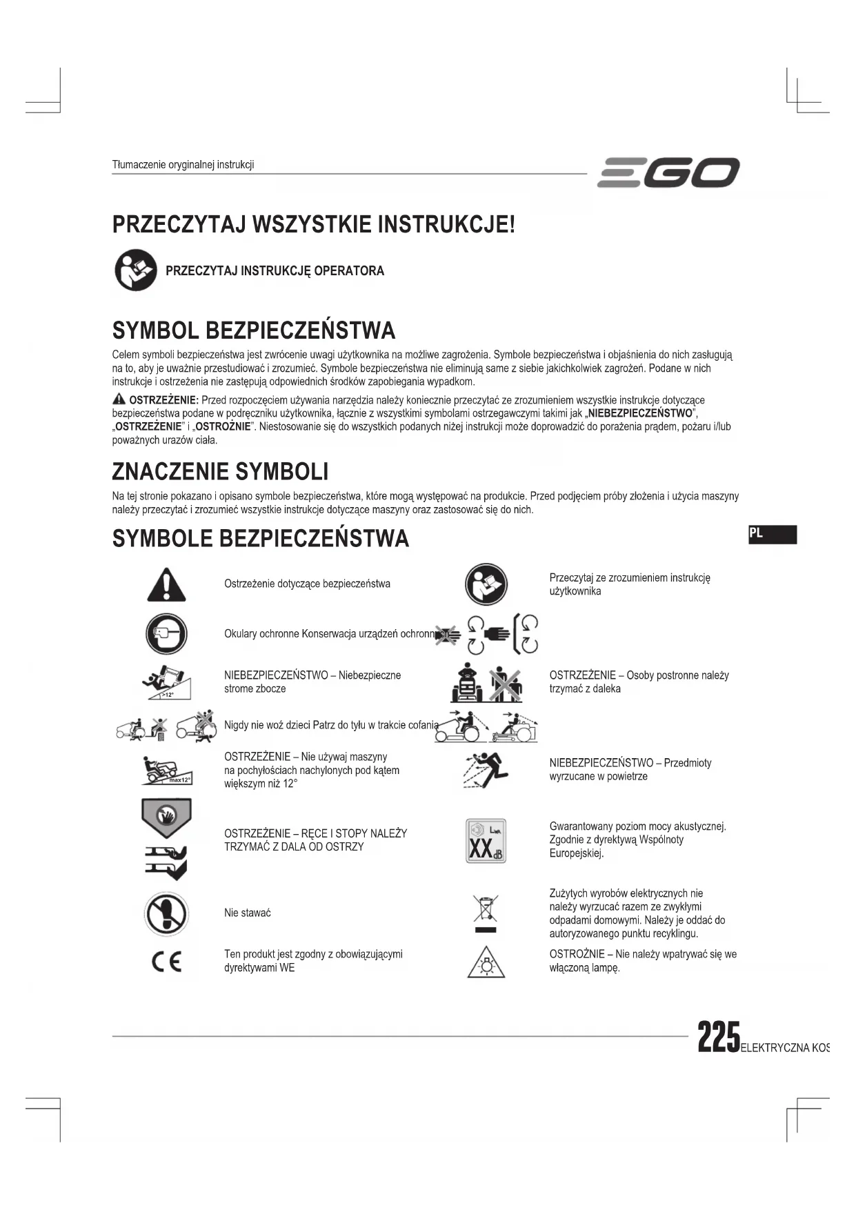 Wyświetlacz LCD Opis Wskaźnik stanu traktorka Kontrolka audio Przyczyna Rozwiązanie Ikona każdej zajętej komory akumulatora i ikona alarmu migają co pół sekundy. Miga na czerwono Kontynuuje wydawanie sygnałów dźwiękowych Silnik ostrza przerywa działanie a przełącznik WOM nie jest ustawiony w pozycji off. Traktorek natychmiast przestanie pracować. Operator powinien przestawić traktorek w miejsce ładowania akumulatora w celu naładowania. Na ekranie LCD zapala się ikona CCS Świeci na zielono Nie Traktorek kontynuuje jazdę do przodu z ustawioną prędkością bez konieczności naciskania na pedał gazu. Jest to normalne. W razie potrzeby należy wyłączyć funkcję CCS zgodnie z instrukcjami podanymi w części „Zatrzymywanie (wyłączanie) tempomatu (CCS)” w instrukcji obsługi. Na ekranie LCD miga ikona CCS. NIE ŚWIECI Nie Awaria funkcji CCS (system tempomatu). Gdy traktorek jedzie z bardzo małą prędkością lub jedzie na biegu wstecznym, funkcji CCS nie można nastawić. W celu zatrzymania traktorka został wciśnięty pedał hamulca postojowego. Po zwolnieniu pedału hamulca postojowego nacisnąć przycisk CCS; na wyświetlaczu LCD zapali się ikona CCS, lub wyłączyć funkcję CCS zgodnie z instrukcjami podanymi w części „Zatrzymywanie (wyłączanie) tempomatu (CCS)”. n.d. n.d. NIE ŚWIECI Kontynuuje wydawanie sygnałów dźwiękowych Traktorek jest zaparkowany na pochyłości, a operator opuszcza go bez ustawienia pedału hamulca postojowego w pozycji hamulca postojowego. Ustawić pedał hamulca postojowego w położeniu hamulca postojowego. Zapala się ikona hamulca postojowego, wskaźnik dźwiękowy przestaje emitować sygnał dźwiękowy. OFF Usterka portu ładowania Świeci na czerwono stałym światłem n.d. Brak zasilania. Sprawdzić, czy napięcie w gniazdku ściennym wynosi 220-240 V lub czy gniazdko jest w dobrym stanie. Świeci na czerwono stałym światłem n.d. Usterki elektroniczne, takie jak przerwa w obwodzie portu ładowania, przepalenie się bezpiecznika itp. Skontaktować się z punktem serwisowym EGO w celu dokonania naprawy.243ELEKTRYCZNA KOSIARKA TRAWNIKOWA – TR4200E