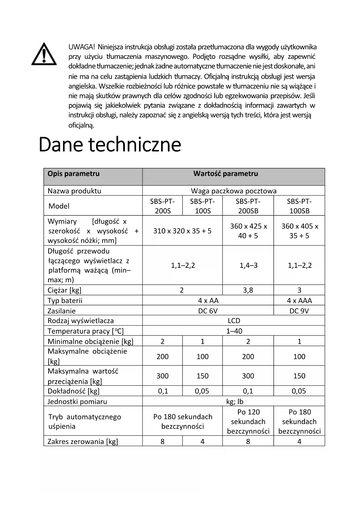 UWAGA! Niniejsza instrukcja obsługi została przetłumaczona dla wygody użytkownika przy użyciu tłumaczenia maszynowego. Podjęto rozsądne wysiłki, aby zapewnić dokładne tłumaczenie; jednak żadne automatyczne tłumaczenie nie jest doskonałe, ani nie ma na celu zastąpienia ludzkich tłumaczy. Oficjalną instrukcją obsługi jest wersja angielska. Wszelkie rozbieżności lub różnice powstałe w tłumaczeniu nie są wiążące i nie mają skutków prawnych dla celów zgodności lub egzekwowania przepisów. Jeśli pojawią się jakiekolwiek pytania związane z dokładnością informacji zawartych w instrukcji obsługi, należy zapoznać się z angielską wersją tych treści, która jest wersją oficjalną.Opis parametru Wartość parametru Nazwa produktu Waga paczkowa pocztowa Model SBS-PT-200SK SBS-PT-100SK Wymiary [długość x szerokość x wysokość; mm] 360 x 405 x 65 Wymiary wyświetlacza [mm] 135 x 65 Ciężar [kg] 3,5 Typ baterii 4 x AA Zasilanie DC 6V Rodzaj wyświetlacza LCD Temperatura pracy [