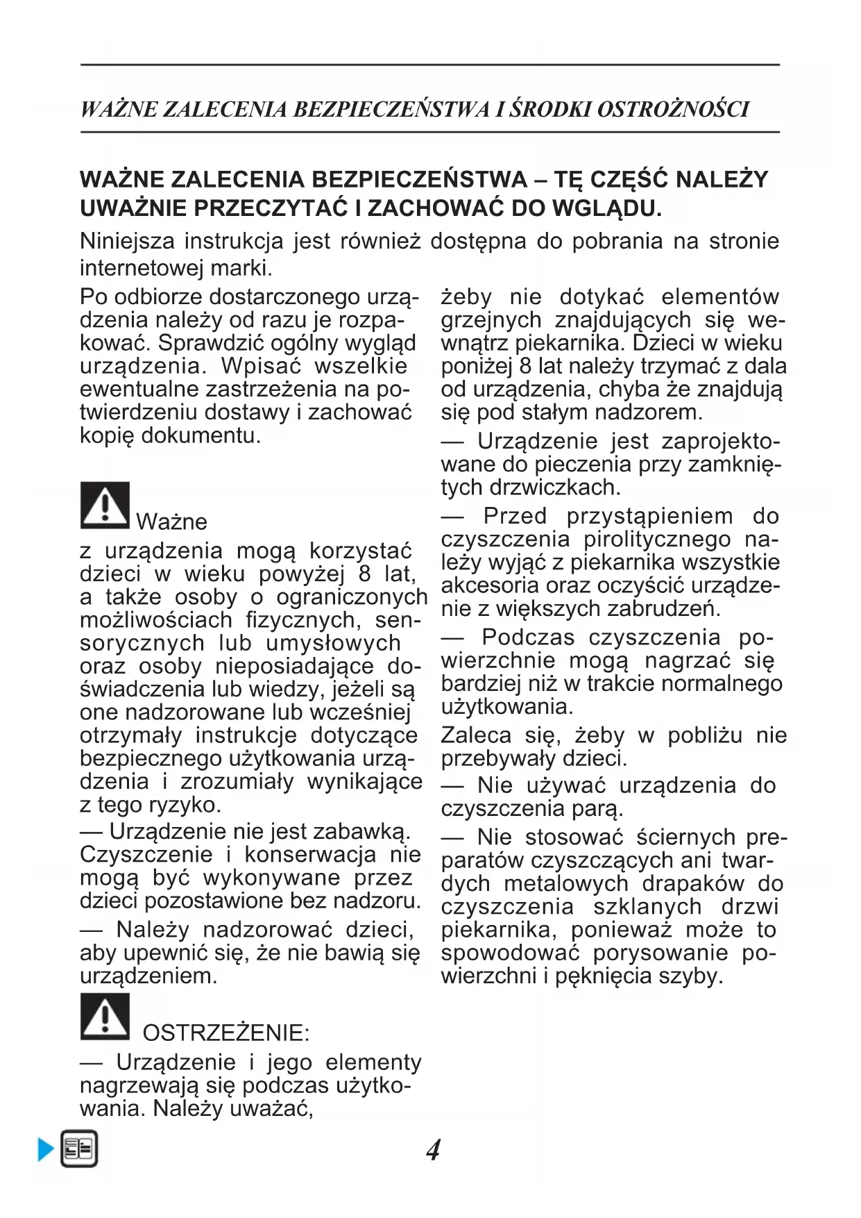 WAŻNE ZALECENIA BEZPIECZEŃSTWA I ŚRODKI OSTROŻNOŚCI Po odbiorze dostarczonego urzą- dzenia należy od razu je rozpa- kować. Sprawdzić ogólny wygląd urządzenia. Wpisać wszelkie ewentualne zastrzeżenia na po- twierdzeniu dostawy i zachować kopię dokumentu. Ważne z urządzenia mogą korzystać dzieci w wieku powyżej 8 lat, a także osoby o ograniczonych możliwościach zycznych, sen- sorycznych lub umysłowych oraz osoby nieposiadające do- świadczenia lub wiedzy, jeżeli są one nadzorowane lub wcześniej otrzymały instrukcje dotyczące bezpiecznego użytkowania urzą- dzenia i zrozumiały wynikające z tego ryzyko. — Urządzenie nie jest zabawką. Czyszczenie i konserwacja nie mogą być wykonywane przez dzieci pozostawione bez nadzoru. — Należy nadzorować dzieci, aby upewnić się, że nie bawią się urządzeniem. OSTRZEŻENIE: — Urządzenie i jego elementy nagrzewają się podczas użytko- wania. Należy uważać, żeby nie dotykać elementów grzejnych znajdujących się we- wnątrz piekarnika. Dzieci w wieku poniżej 8 lat należy trzymać z dala od urządzenia, chyba że znajdują się pod stałym nadzorem. — Urządzenie jest zaprojekto- wane do pieczenia przy zamknię- tych drzwiczkach. — Przed przystąpieniem do czyszczenia pirolitycznego na- leży wyjąć z piekarnika wszystkie akcesoria oraz oczyścić urządze- nie z większych zabrudzeń. — Podczas czyszczenia po- wierzchnie mogą nagrzać się bardziej niż w trakcie normalnego użytkowania. Zaleca się, żeby w pobliżu nie przebywały dzieci. — Nie używać urządzenia do czyszczenia parą. — Nie stosować ściernych pre- paratów czyszczących ani twar- dych metalowych drapaków do czyszczenia szklanych drzwi piekarnika, ponieważ może to spowodować porysowanie po- wierzchni i pęknięcia szyby. WAŻNE ZALECENIA BEZPIECZEŃSTWA – TĘ CZĘŚĆ NALEŻY UWAŻNIE PRZECZYTAĆ I ZACHOWAĆ DO WGLĄDU. Niniejsza instrukcja jest również dostępna do pobrania na stronie internetowej marki.5 WAŻNE ZALECENIA BEZPIECZEŃSTWA I ŚRODKI OSTROŻNOŚCI OSTRZEŻENIE. Przed przystąpieniem do wy- miany lampy upewnić się, że urządzenie jest wyłączone od zasilania, aby uniknąć ryzyka po- rażenia prądem. Należy wykony- wać jakiekolwiek prace dopiero, kiedy urządzenie jest schłodzone. Do odkręcania oprawy i lampy używać gumowej rękawicy, która ułatwi demontaż. Musi istnieć możliwość odłączenia urządzenia od sieci zasilania poprzez umieszczenie wyłącznika w stałych przewodach rurowych zgodnie z zasadami in- stalacji. — Jeśli kabel zasilania jest uszkodzony, powinien zostać wy- mieniony przez producenta, jego serwis posprzedażny lub osoby o podobnych kwalifikacjach w celu uniknięcia zagrożenia. — Urządzenie może być zainsta- lowane pod blatem lub w kolum- nie jak pokazano na schemacie instalacji. — Ustawić piekarnik wewnątrz szafki w taki sposób, aby odle- głość od sąsiedniego mebla wy- nosiła co najmniej 10 mm. Mebel do zabudowy piekarnika powinien być wykonany z materiału odpor- nego na wysoką temperaturę (lub pokryty takim materiałem). Dla zapewnienia większej stabilności należy przymocować piekarnik w szafce za pomocą 2 śrub w prze- widzianych do tego otworach. — Aby uniknąć przegrzania, urzą- dzenia nie należy zabudowywać drzwiczkami frontowymi. — To urządzenie jest prze- znaczone do użytku w gospo- darstwach domowych i innych miejscach, takich jak: sklepy, biura i inne obiekty; gospodar- stwa rolne; hotele, motele i inne obiekty mieszkalne oraz pokoje gościnne, czyli wszędzie tam, gdzie urządzenie to mogłoby być używane przez pracowników lub gości w podobnych celach jak w gospodarstwach domowych. — Podczas wykonywania ja- kichkolwiek prac dotyczących czyszczenia wnętrza piekarnika, urządzenie musi być wyłączone. Nie wolno modykować parame- trów tego urządzenia, ponieważ będzie to stanowić niebezpie- czeństwo dla użytkownika. Piekarnik nie jest przeznaczony do przechowywania żywności lub jakichkolwiek przedmiotów.6