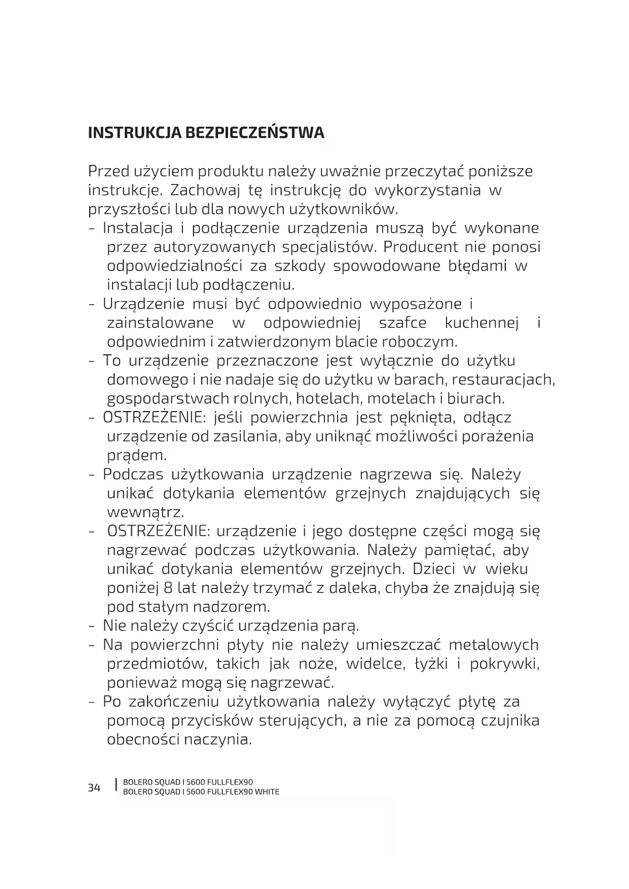 Przed użyciem produktu należy uważnie przeczytać poniższe instrukcje. Zachowaj tę instrukcję do wykorzystania w przyszłości lub dla nowych użytkowników. - Instalacja i podłączenie urządzenia muszą być wykonane przez autoryzowanych specjalistów. Producent nie ponosi odpowiedzialności za szkody spowodowane błędami w instalacji lub podłączeniu. - Urządzenie musi być odpowiednio wyposażone i zainstalowane w odpowiedniej szafce kuchennej i odpowiednim i zatwierdzonym blacie roboczym. - To urządzenie przeznaczone jest wyłącznie do użytku domowego i nie nadaje się do użytku w barach, restauracjach, gospodarstwach rolnych, hotelach, motelach i biurach. - OSTRZEŻENIE: jeśli powierzchnia jest pęknięta, odłącz urządzenie od zasilania, aby uniknąć możliwości porażenia prądem. - Podczas użytkowania urządzenie nagrzewa się. Należy unikać dotykania elementów grzejnych znajdujących się wewnątrz. - OSTRZEŻENIE: urządzenie i jego dostępne części mogą się nagrzewać podczas użytkowania. Należy pamiętać, aby unikać dotykania elementów grzejnych. Dzieci w wieku poniżej 8 lat należy trzymać z daleka, chyba że znajdują się pod stałym nadzorem. - Nie należy czyścić urządzenia parą. - Na powierzchni płyty nie należy umieszczać metalowych przedmiotów, takich jak noże, widelce, łyżki i pokrywki, ponieważ mogą się nagrzewać. - Po zakończeniu użytkowania należy wyłączyć płytę za pomocą przycisków sterujących, a nie za pomocą czujnika obecności naczynia.35
