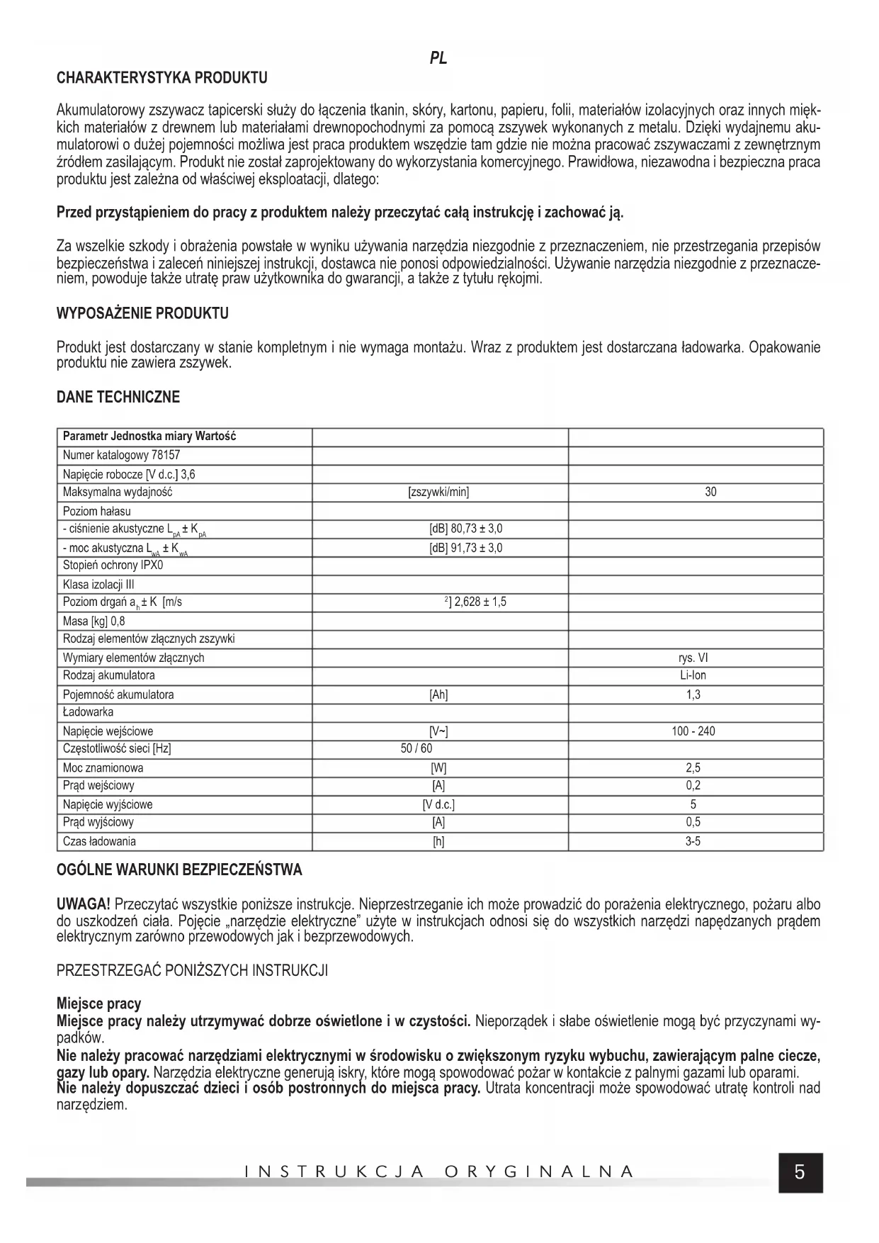 Produkt jest dostarczany w stanie kompletnym i nie wymaga montażu. Wraz z produktem jest dostarczana ładowarka. Opakowanie produktu nie zawiera zszywek. DANE TECHNICZNE Parametr Jednostka miary Wartość Numer katalogowy 78157 Napięcie robocze [V d.c.] 3,6 Maksymalna wydajność [zszywki/min] 30 Poziom hałasu - ciśnienie akustyczne L