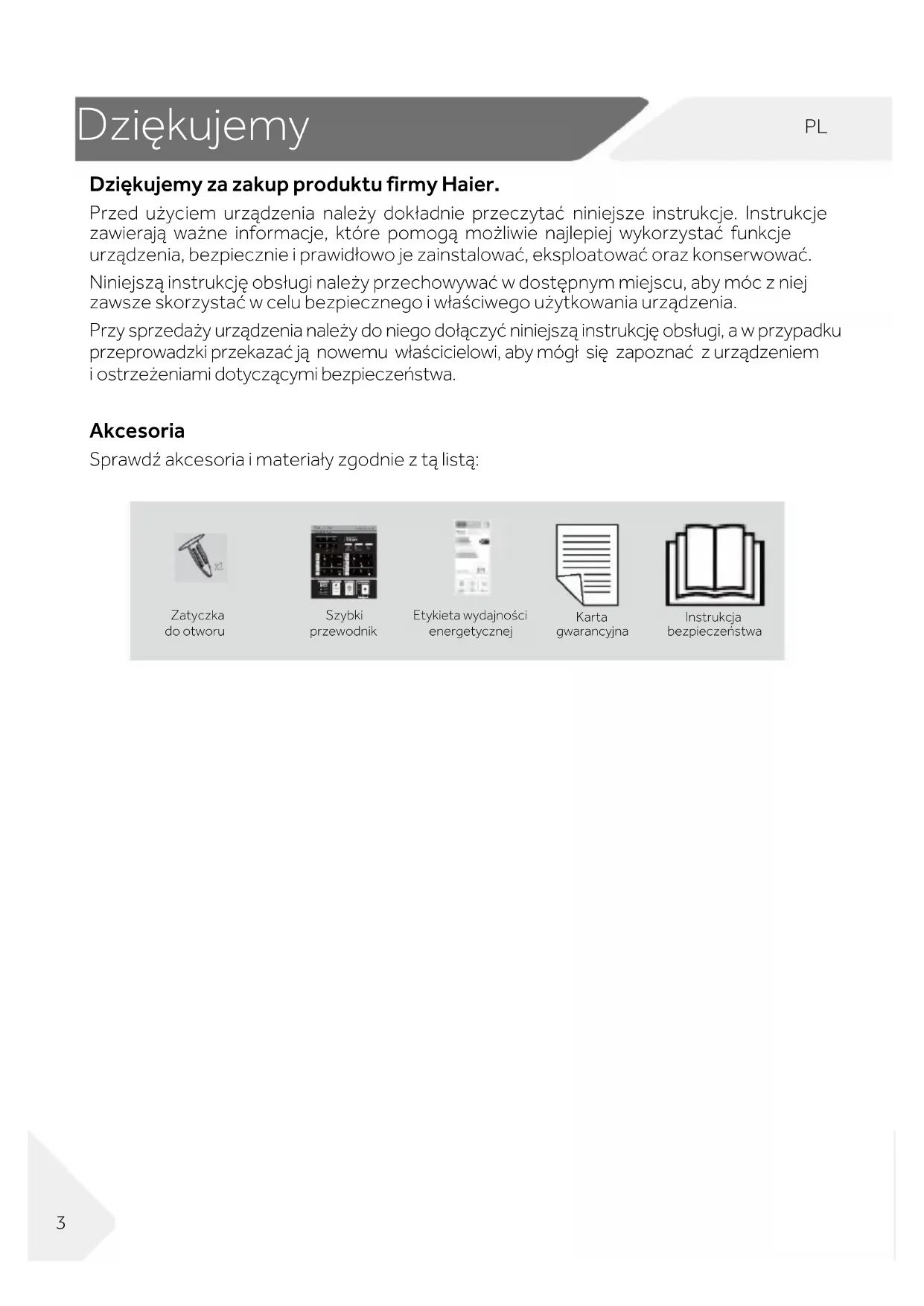 Dziękujemy za zakup produktu firmy Haier. Przed użyciem urządzenia należy dokładnie przeczytać niniejsze instrukcje. Instrukcje zawierają ważne informacje, które pomogą możliwie najlepiej wykorzystać funkcje urządzenia, bezpiecznie i prawidłowo je zainstalować, eksploatować oraz konserwować. Niniejszą instrukcję obsługi należy przechowywać w dostępnym miejscu, aby móc z niej zawsze skorzystać w celu bezpiecznego i właściwego użytkowania urządzenia. Przy sprzedaży urządzenia należy do niego dołączyć niniejszą instrukcję obsługi, a w przypadku przeprowadzki przekazać ją nowemu właścicielowi, aby mógł się zapoznać z urządzeniem i ostrzeżeniami dotyczącymi bezpieczeństwa. Akcesoria Sprawdź akcesoria i materiały zgodnie z tą listą:
