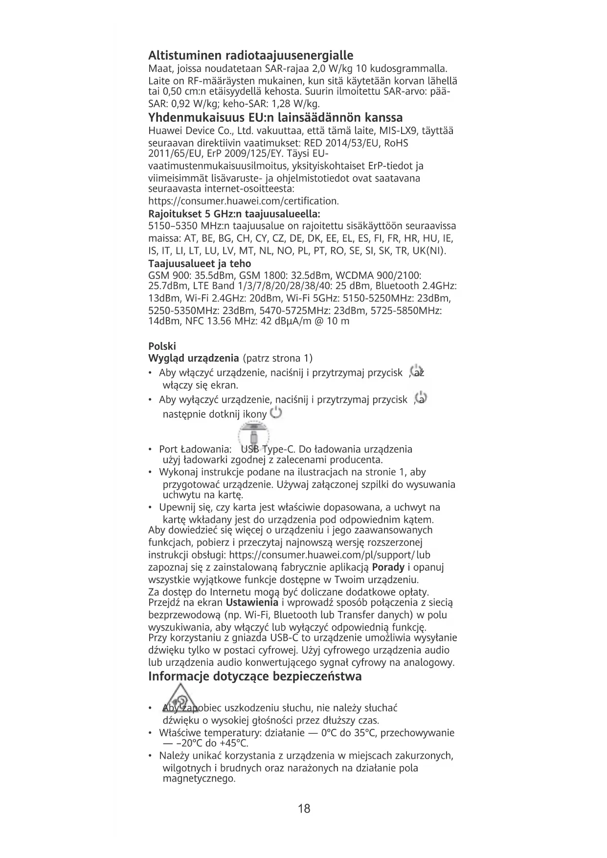 - miejscach sprzedaży podobnych urządzeń. Sprzedawcy detaliczni i sprzedawcy hurtowi są zobowiązani są nieodpłatnego przyjęcia zużytego sprzętu w ilości nie większej niż sprzedawany nowy sprzęt, jeżeli zużyty sprzęt jest tego samego rodzaju. Jeśli twój produkt zawiera baterię należy pamiętać, iż baterii nie należy wyrzucać wraz z innymi odpadami w tym samym pojemniku. Baterie należy wyrzucić do specjalnie oznaczonych pojemników przy punktach zbierania odpadów lub w sklepach ze sprzętem elektronicznym. Szczegółowych informacji na temat jak i gdzie można pozbyć się zużytych baterii udzielają władze lokalne. W ten sposób możesz uczestniczyć w procesie ponownego wykorzystywania surowców i wspierać program utylizacji odpadów elektrycznych i elektronicznych, co może mieć wpływ na środowisko i zdrowie publiczne. Pamiętać należy, iż prawidłowa utylizacja sprzętu umożliwia zachowanie cennych zasobów i uniknięcie negatywnego wpływu na zdrowie i środowisko, które może być zagrożone przez nieodpowiednie postępowanie z odpadami i składnikami niebezpiecznymi. Informacja o ekspozycji na promieniowanie radiowe Informacje dotyczące krajów, w których przyjęto wartość graniczną SAR na poziomie 2,0 W/kg dla próbki 10 gramów tkanki. Urządzenie jest zgodne ze specykacjami dotyczącymi emisji fal radiowych, gdy jest używane blisko ucha lub w odległości 0,50 cm od ciała. Najwyższa zgłoszona wartość SAR: Dla głowy: 0,92 W/kg; dla ciała: 1,28 W/kg. Zgodność z przepisami UE Firma Huawei Device Co., Ltd. niniejszym deklaruje, że to urządzenie MIS-LX9 spełnia wymagania następujących dyrektyw: RED 2014/53/UE, RoHS 2011/65/UE, ErP 2009/125/WE. Pełną treść deklaracji zgodności z normami UE, szczegółowe informacje dotyczące produktów związanych z energią oraz aktualne informacje dotyczące akcesoriów i oprogramowania można uzyskać pod następującym adresem: https://consumer.huawei.com/certication