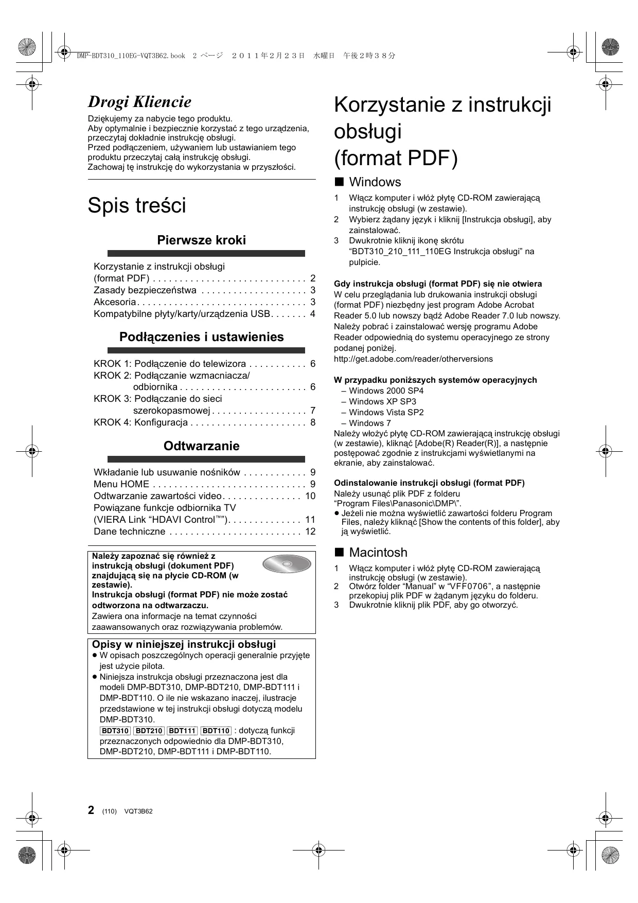 (110) VQT3B62 Włącz komputer i włóż płytę CD-ROM zawierającą instrukcję obsługi (w zestawie). Wybierz żądany język i kliknij [Instrukcja obsługi], aby zainstalować. Dwukrotnie kliknij ikonę skrótu “BDT310_210_111_110EG Instrukcja obsługi” na pulpicie. Gdy instrukcja obsługi (format PDF) się nie otwiera W celu przeglądania lub drukowania instrukcji obsługi (format PDF) niezbędny jest program Adobe Acrobat Reader 5.0 lub nowszy bądź Adobe Reader 7.0 lub nowszy. Należy pobrać i zainstalować wersję programu Adobe Reader odpowiednią do systemu operacyjnego ze strony podanej poniżej. http://get.adobe.com/reader/otherversions W przypadku poniższych systemów operacyjnych – Windows 2000 SP4 – Windows XP SP3 – Windows Vista SP2 – Windows 7 Należy włożyć płytę CD-ROM zawierającą instrukcję obsługi (w zestawie), kliknąć [Adobe(R) Reader(R)], a następnie postępować zgodnie z instrukcjami wyświetlanymi na ekranie, aby zainstalować. Odinstalowanie instrukcji obsługi (format PDF) Należy usunąć plik PDF z folderu “Program Files\Panasonic\DMP\”. ≥ Jeżeli nie można wyświetlić zawartości folderu Program Files, należy kliknąć [Show the contents of this folder], aby ją wyświetlić. ∫ Macintosh