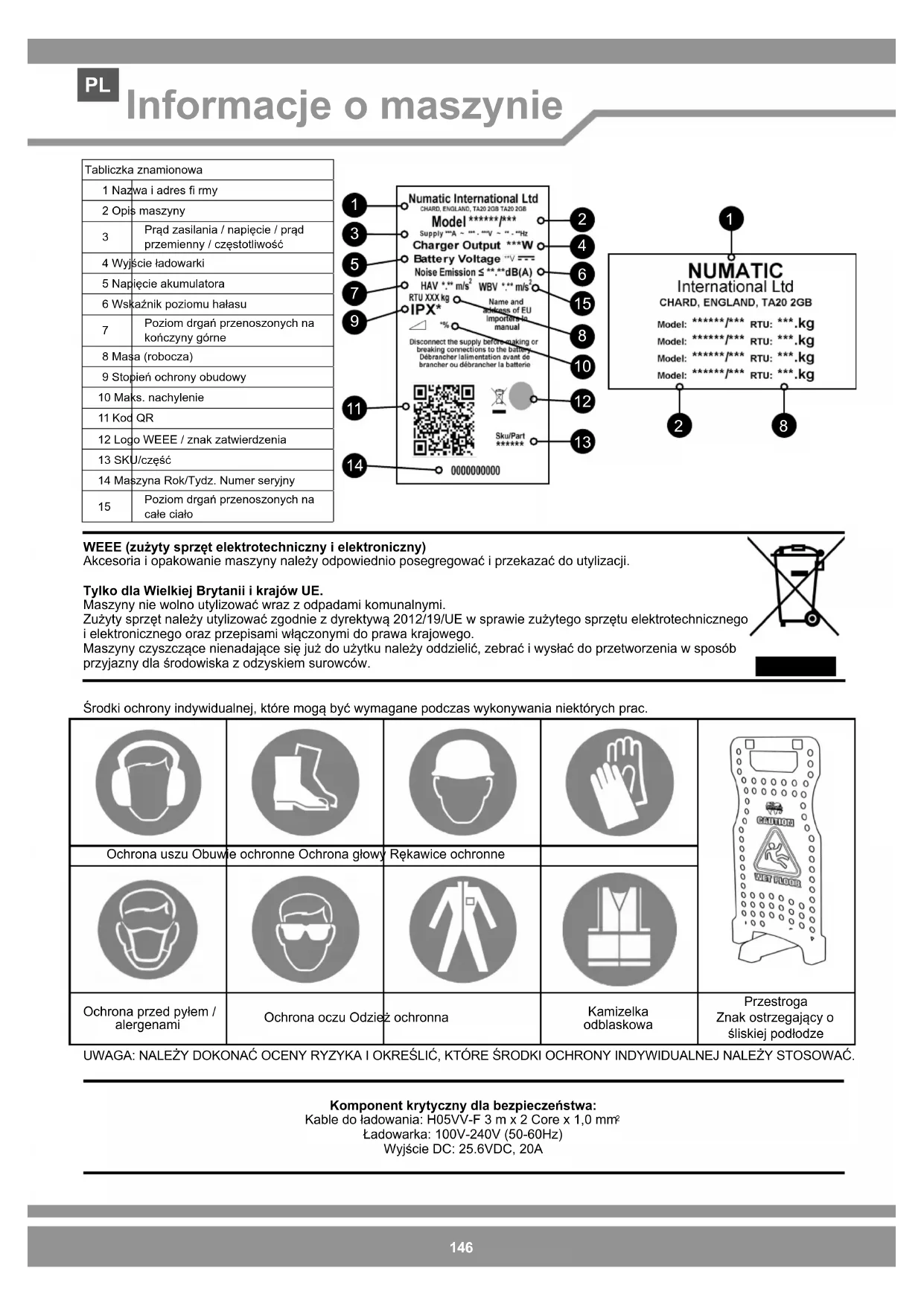 Ładowarka: 100V-240V (50-60Hz) Wyjście DC: 25.6VDC, 20A Ochrona uszu Obuwie ochronne Ochrona głowy Rękawice ochronne Ochrona przed pyłem / alergenami Ochrona oczu Odzież ochronna Kamizelka odblaskowa Przestroga Znak ostrzegający o śliskiej podłodze Środki ochrony indywidualnej, które mogą być wymagane podczas wykonywania niektórych prac. UWAGA: NALEŻY DOKONAĆ OCENY RYZYKA I OKREŚLIĆ, KTÓRE ŚRODKI OCHRONY INDYWIDUALNEJ NALEŻY STOSOWAĆ. Tabliczka znamionowa1 Nazwa i adres rmy2 Opis maszyny Prąd zasilania / napięcie / prąd przemienny / częstotliwość4 Wyjście ładowarki5 Napięcie akumulatora6 Wskaźnik poziomu hałasu Poziom drgań przenoszonych na kończyny górne8 Masa (robocza)9 Stopień ochrony obudowy10 Maks. nachylenie11 Kod QR12 Logo WEEE / znak zatwierdzenia13 SKU/część14 Maszyna Rok/Tydz. Numer seryjny Poziom drgań przenoszonych na całe ciało