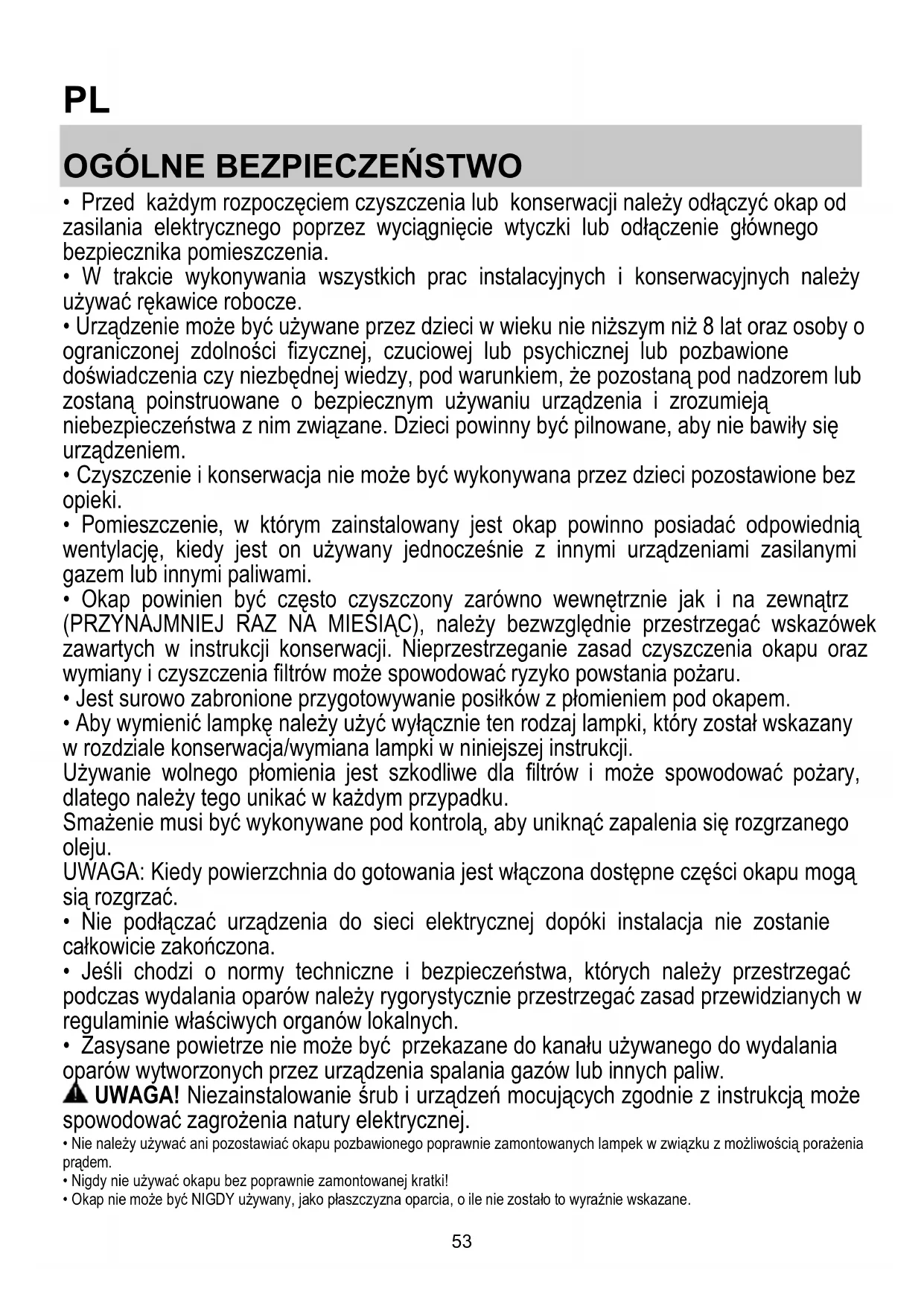- Aby wymienić lampkę należy użyć wyłącznie ten rodzaj lampki, który został wskazany w rozdziale konserwacja/wymiana lampki w niniejszej instrukcji. Używanie wolnego płomienia jest szkodliwe dla filtrów i może spowodować pożary, dlatego należy tego unikać w każdym przypadku. Smażenie musi być wykonywane pod kontrolą, aby uniknąć zapalenia się rozgrzanego oleju. UWAGA: Kiedy powierzchnia do gotowania jest włączona dostępne części okapu mogą sią rozgrzać.