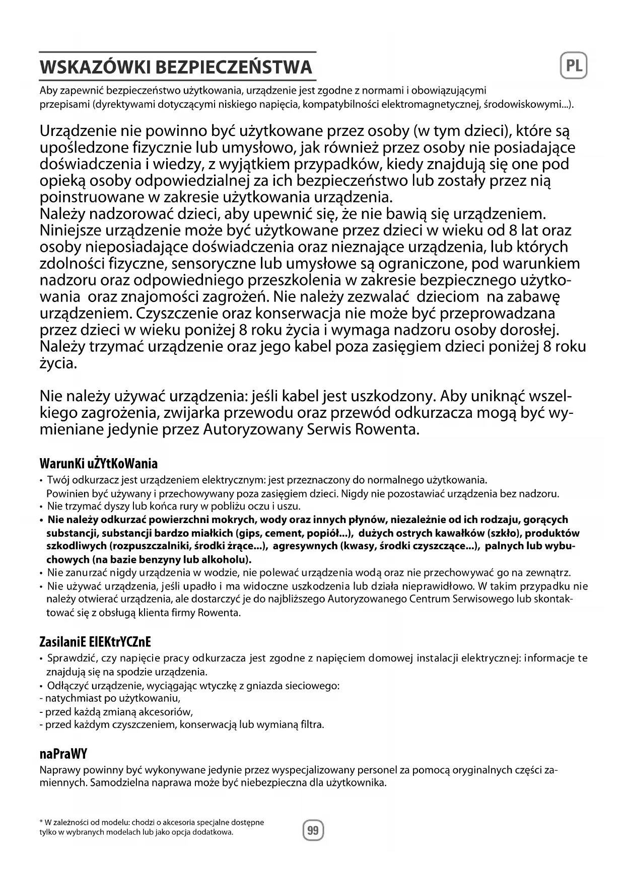 Aby zapewnić bezpieczeństwo użytkowania, urządzenie jest zgodne z normami i obowiązującymi przepisami (dyrektywami dotyczącymi niskiego napięcia, kompatybilności elektromagnetycznej, środowiskowymi...). Urządzenie nie powinno być użytkowane przez osoby (w tym dzieci), które są upośledzone fizycznie lub umysłowo, jak również przez osoby nie posiadające doświadczenia i wiedzy, z wyjątkiem przypadków, kiedy znajdują się one pod opieką osoby odpowiedzialnej za ich bezpieczeństwo lub zostały przez nią poinstruowane w zakresie użytkowania urządzenia. Należy nadzorować dzieci, aby upewnić się, że nie bawią się urządzeniem. Niniejsze urządzenie może być użytkowane przez dzieci w wieku od 8 lat oraz osoby nieposiadające doświadczenia oraz nieznające urządzenia, lub których zdolności fizyczne, sensoryczne lub umysłowe są ograniczone, pod warunkiem nadzoru oraz odpowiedniego przeszkolenia w zakresie bezpiecznego użytko- wania oraz znajomości zagrożeń. Nie należy zezwalać dzieciom na zabawę urządzeniem. Czyszczenie oraz konserwacja nie może być przeprowadzana przez dzieci w wieku poniżej 8 roku życia i wymaga nadzoru osoby dorosłej. Należy trzymać urządzenie oraz jego kabel poza zasięgiem dzieci poniżej 8 roku życia. Nie należy używać urządzenia: jeśli kabel jest uszkodzony. Aby uniknąć wszel- kiego zagrożenia, zwijarka przewodu oraz przewód odkurzacza mogą być wy- mieniane jedynie przez Autoryzowany Serwis Rowenta. WarunKi uŻYtKoWania