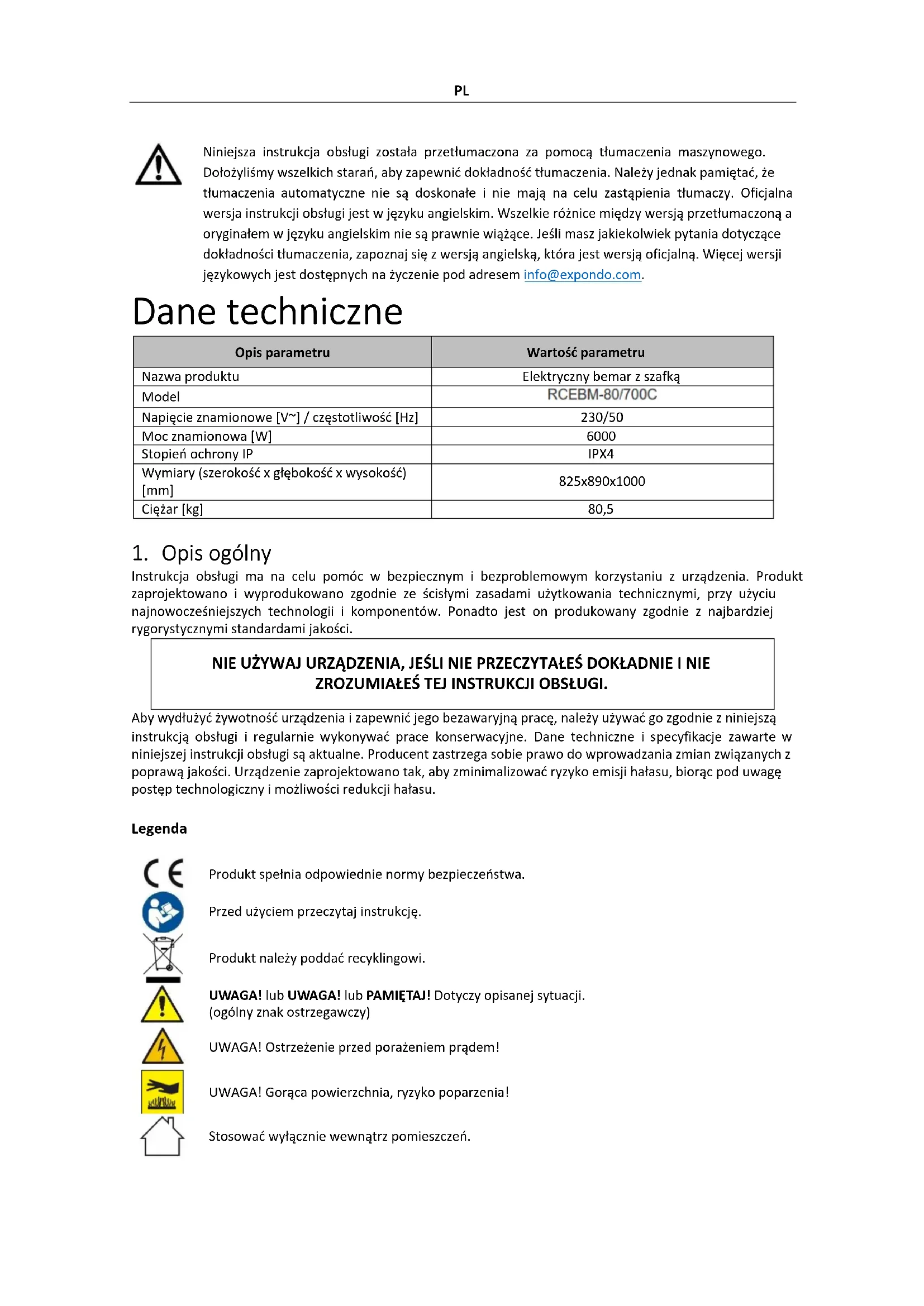Niniejsza instrukcja obsługi została przetłumaczona za pomocą tłumaczenia maszynowego. Dołożyliśmy wszelkich starań, aby zapewnić dokładność tłumaczenia. Należy jednak pamiętać, że tłumaczenia automatyczne nie są doskonałe i nie mają na celu zastąpienia tłumaczy. Oficjalna wersja instrukcji obsługi jest w języku angielskim. Wszelkie różnice między wersją przetłumaczoną a oryginałem w języku angielskim nie są prawnie wiążące. Jeśli masz jakiekolwiek pytania dotyczące dokładności tłumaczenia, zapoznaj się z wersją angielską, która jest wersją oficjalną. Więcej wersji językowych jest dostępnych na życzenie pod adresem info@expondo.com. Dane techniczne Opis parametru Wartość parametru Nazwa produktu Elektryczny bemar z szafką Model