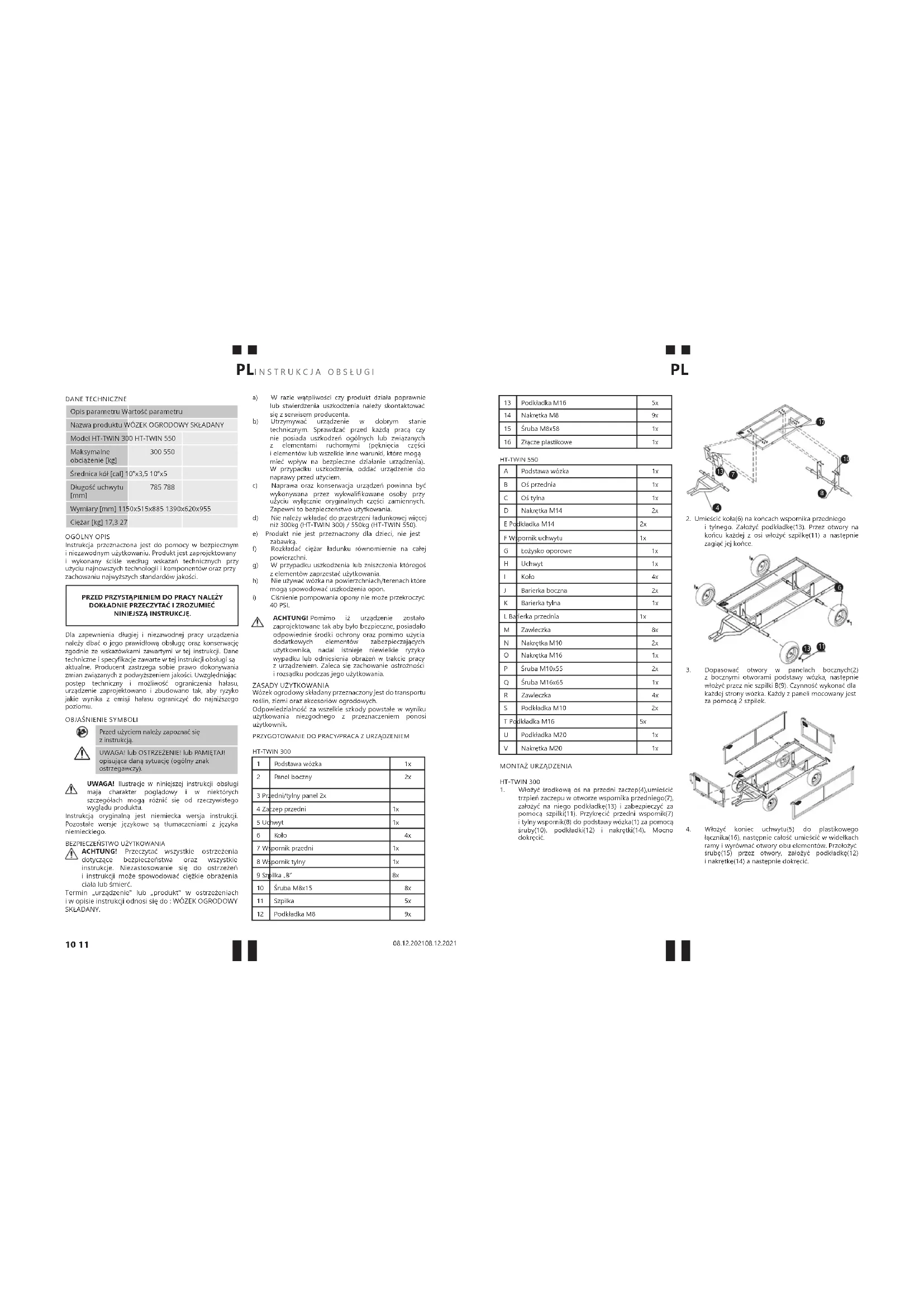 HT-TWIN 300 ACHTUNG! Przeczytać wszystkie ostrzeżenia dotyczące bezpieczeństwa oraz wszystkie instrukcje. Niezastosowanie się do ostrzeżeń i instrukcji może spowodować ciężkie obrażenia ciała lub śmierć. a) W razie wątpliwości czy produkt działa poprawnie lub stwierdzenia uszkodzenia należy skontaktować się z serwisem producenta. b) Utrzymywać urządzenie w dobrym stanie technicznym. Sprawdzać przed każdą pracą czy nie posiada uszkodzeń ogólnych lub związanych z elementami ruchomymi (pęknięcia części i elementów lub wszelkie inne warunki, które mogą mieć wpływ na bezpieczne działanie urządzenia). W przypadku uszkodzenia, oddać urządzenie do naprawy przed użyciem. c) Naprawa oraz konserwacja urządzeń powinna być wykonywana przez wykwalikowane osoby przy użyciu wyłącznie oryginalnych części zamiennych. Zapewni to bezpieczeństwo użytkowania. d) Nie należy wkładać do przestrzeni ładunkowej więcej niż 300kg (HT-TWIN 300) / 550kg (HT-TWIN 550). e) Produkt nie jest przeznaczony dla dzieci, nie jest zabawką. f) Rozkładać ciężar ładunku równomiernie na całej powierzchni. g) W przypadku uszkodzenia lub zniszczenia któregoś z elementów zaprzestać użytkowania. h) Nie używać wózka na powierzchniach/terenach które mogą spowodować uszkodzenia opon.