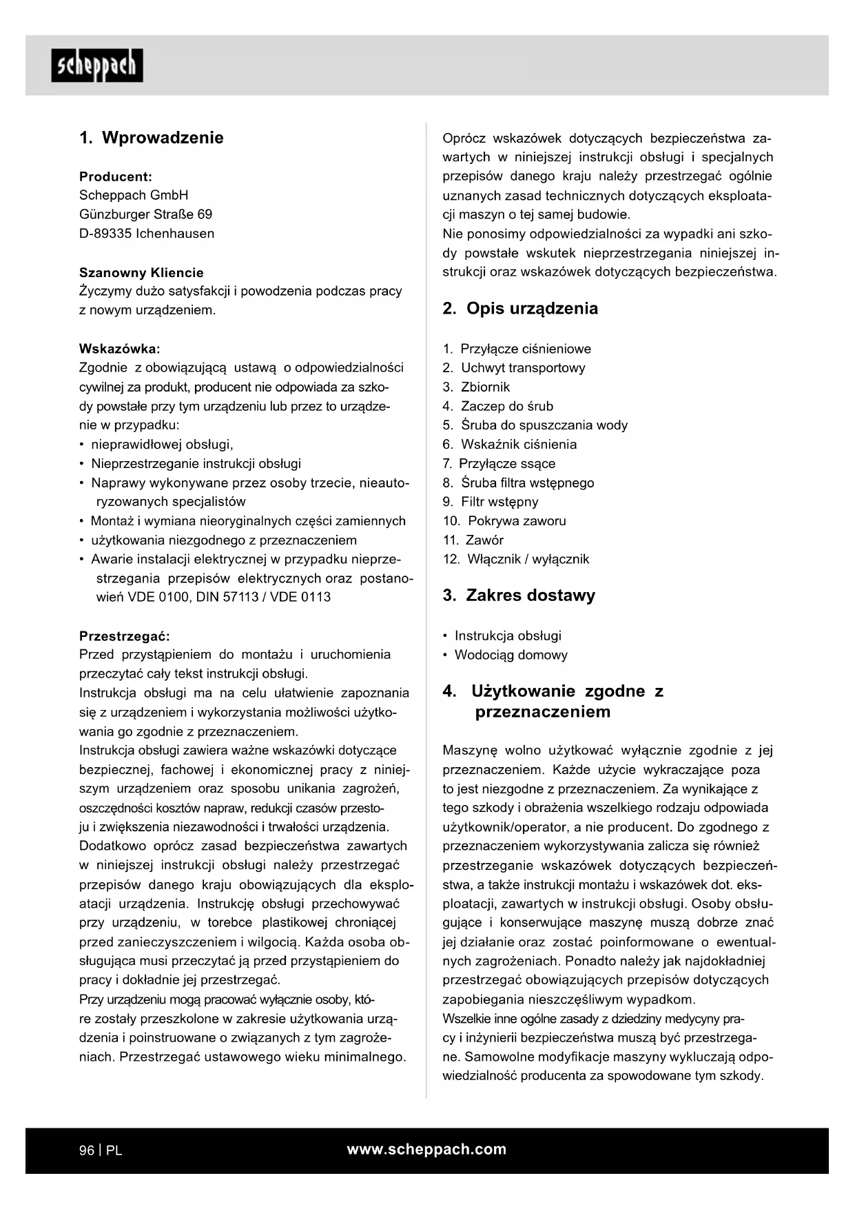 Producent: Scheppach GmbH Günzburger Straße 69 D-89335 Ichenhausen Szanowny Kliencie Życzymy dużo satysfakcji i powodzenia podczas pracy z nowym urządzeniem. Wskazówka: Zgodnie z obowiązującą ustawą o odpowiedzialności cywilnej za produkt, producent nie odpowiada za szko- dy powstałe przy tym urządzeniu lub przez to urządze- nie w przypadku: