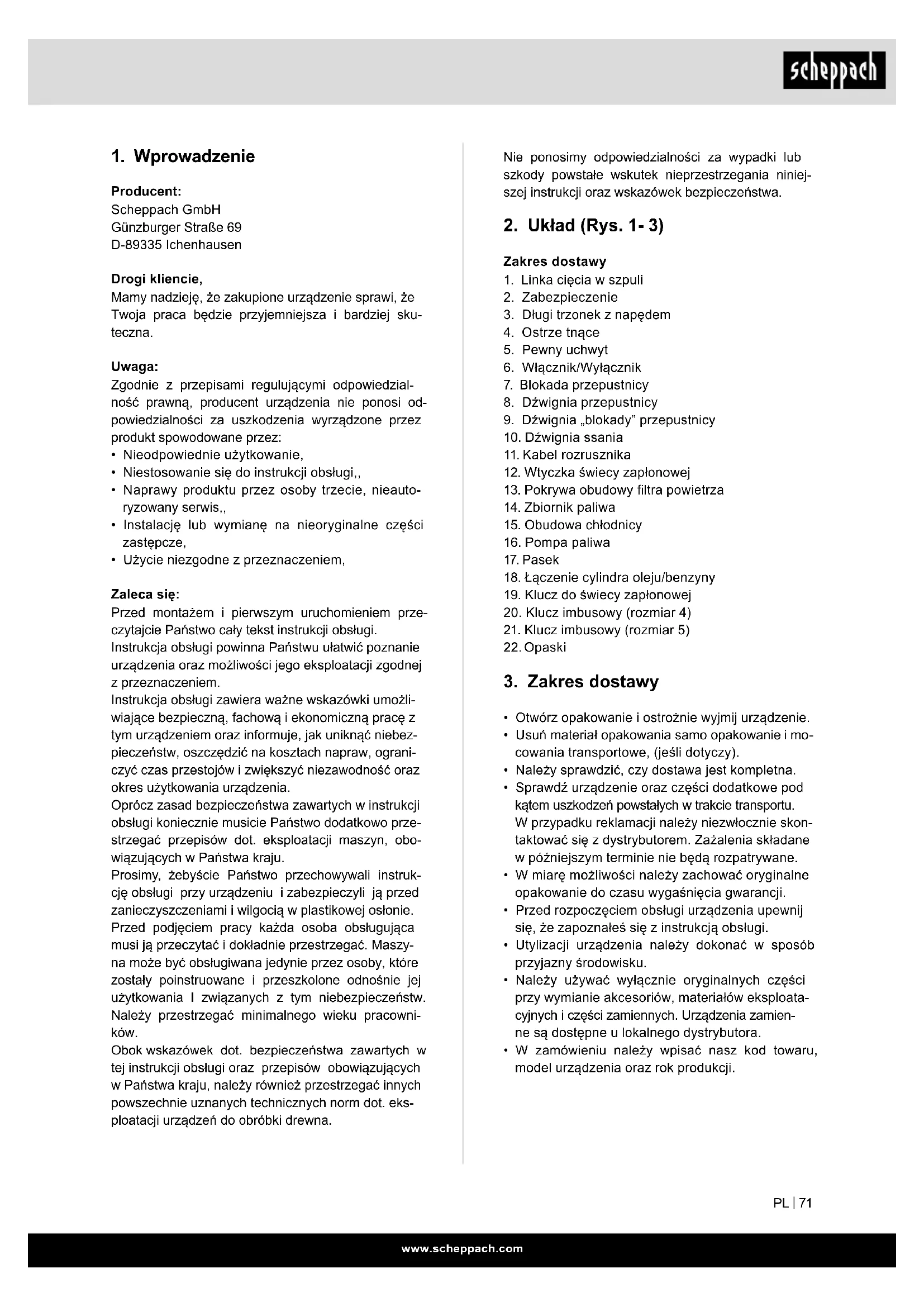 Producent: Scheppach GmbH Günzburger Straße 69 D-89335 Ichenhausen Drogi kliencie, Mamy nadzieję, że zakupione urządzenie sprawi, że Twoja praca będzie przyjemniejsza i bardziej sku- teczna. Uwaga: Zgodnie z przepisami regulującymi odpowiedzial- ność prawną, producent urządzenia nie ponosi od- powiedzialności za uszkodzenia wyrządzone przez produkt spowodowane przez: