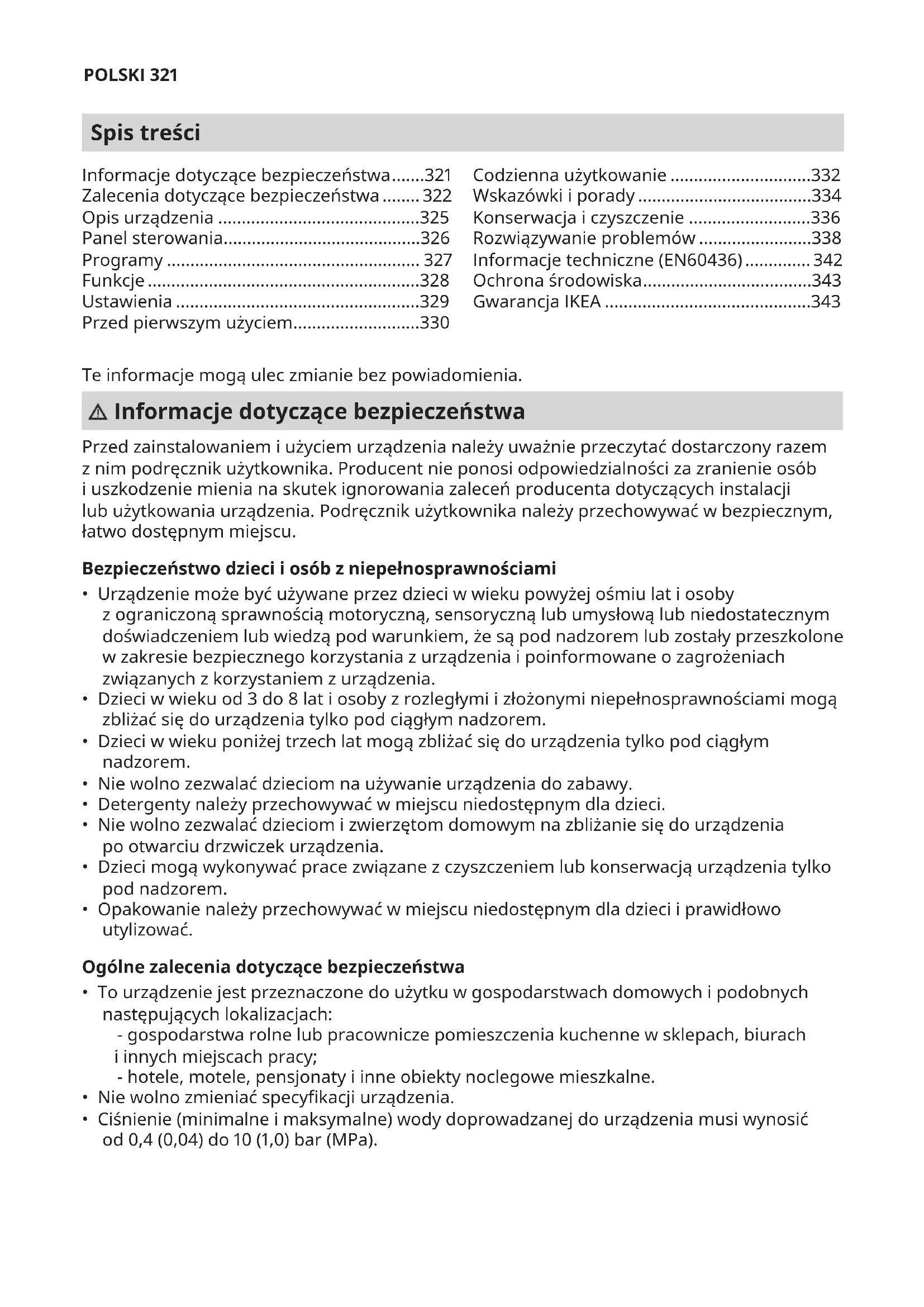 - Ciśnienie (minimalne imaksymalne) wody doprowadzanej dourządzenia musi wynosić od0,4 (0,04) do10 (1,0) bar (MPa). Informacje dotyczące bezpieczeństwa .......321 Zalecenia dotyczące bezpieczeństwa ........ 322 Opis urządzenia ...........................................325 Panel sterowania ..........................................326 Programy ...................................................... 327 Funkcje ..........................................................328 Ustawienia ....................................................329 Przed pierwszym użyciem ...........................330 Codzienna użytkowanie ..............................332 Wskazówki iporady .....................................334 Konserwacja iczyszczenie ..........................336 Rozwiązywanie problemów ........................338 Informacje techniczne (EN60436) .............. 342 Ochrona środowiska ....................................343 Gwarancja IKEA ............................................343POLSKI 322