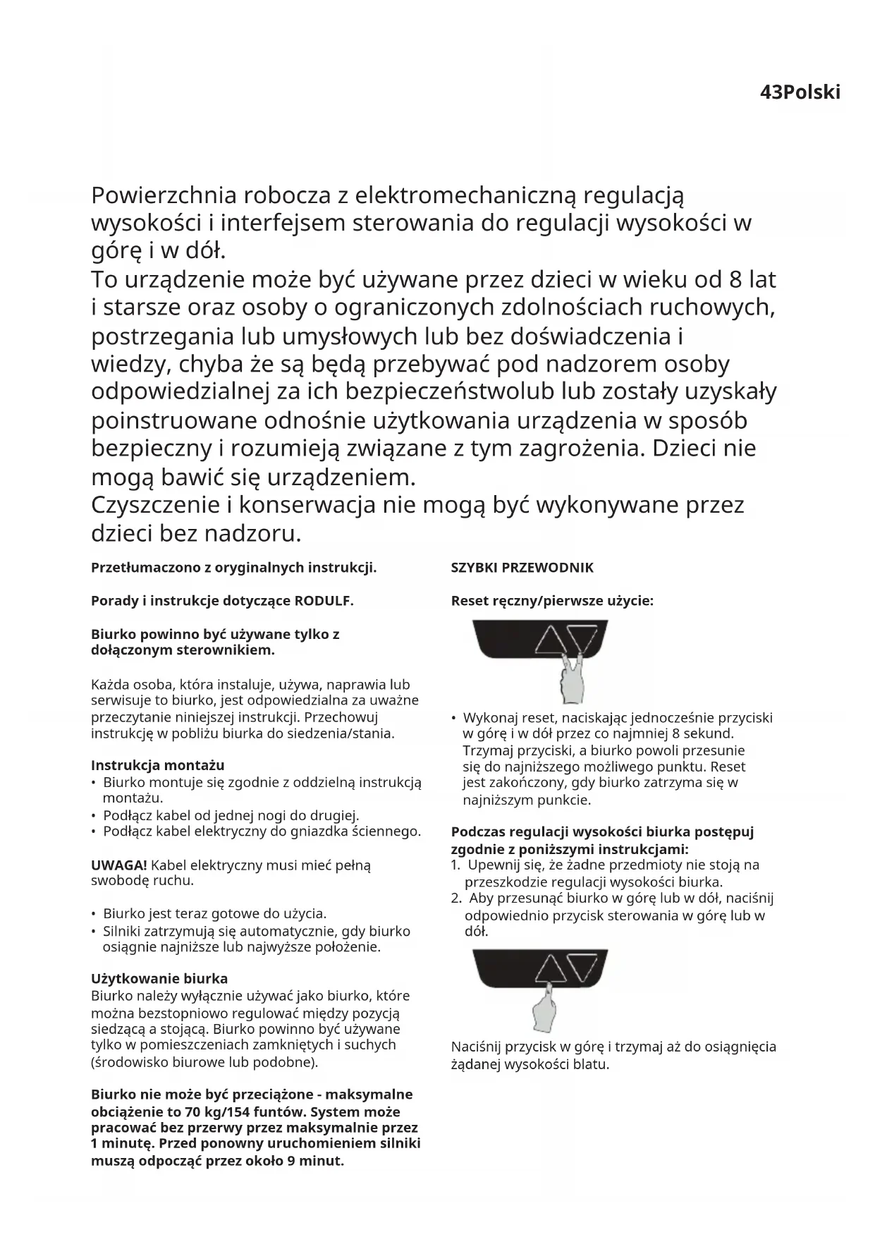 - Wymień część elektryczną, a następnie podłącz ponownie kabel elektryczny do gniazdka ściennego. Biurko jest teraz gotowe do użycia. Jeśli biurko nadal nie działa, skontaktuj się z najbliższym sklepem IKEA lub Działem Obsługi Klienta. Deklaracja Zgodności UE jest dołączona do opakowania jako osobny dokument. Serwisowanieproduktu Nie próbuj samodzielnie naprawiać produktu, ponieważ otwarcie lub zdjęcie pokryw może narazić Cię na niebezpieczne napięcie lub inne ryzyko. Producent:IKEAofSwedenAB Adres:Box702,SE-34381Älmhult,SZWECJA Numertelefonu:+46(0)476-648500 ZACHOWAJTĘINSTRUKCJĘ Przekreślony symbol kosza na odpady oznacza, że oznaczony produkt nie może być wyrzucany wraz ze zmieszanymi odpadami komunalnymi z gospodarstwa domowego. Zużyty sprzęt elektryczny i elektroniczny należy przekazać do przetwarzania i recyklingu zgodnie z obowiązującymi w danym kraju przepisami ochrony środowiska dotyczącymi gospodarowania odpadami. Selektywna zbiórka odpadów m.in. z gospodarstw domowych przyczynia się do zmniejszenia ilość odpadów przekazanych na składowiska lub do spalarni oraz ograniczenia ich potencjalnego negatywnego wpływu na zdrowie ludzi i środowisko. Aby uzyskać więcej informacji, skontaktuj się z najbliższym sklepem IKEA.45 Danetechniczne Nazwamodelu Biurko RODULF do siedzenia/stania 140x80 Numertypu RODULF-GF-470 Wejście 100–240 V AC 50/60 Hz, 3.2-1.5 A Pobórmocywtrybieczuwania <0,1 W Zakrestemperaturyużytkowania: 50–104° F lub 10–40° Zakrestemperaturyprzechowywania: 0–158° F lub -18–70° C Wilgotnośćrobocza 20–90% RH w 40° C Poziomhałasu: <50 dB (A) Zakresustawieniawysokości: 68–115 cm lub 26,8–45,3 cala Maksymalneobciążenie: 70 kg lub 154 funtów Rozwiązywanieproblemów UWAGA! Przed przystąpieniem do konserwacji zawsze wyłącz kabel z gniazdka ściennego! Objaw Sprawdź Wypróbuj Biurko nie porusza się. Upewnij się, że wszystkie kable są podłączone. Podłącz kable. Postępuj zgodnie z instrukcjami instalacji i wykonaj reset. Odłącz biurko od gniazdka ściennego na około 1 minutę i podłącz ponownie. Tylko jedna kolumna się porusza. Przeprowadź reset. Jeżeli w dalszym ciągu porusza się tylk ojedna kolumna, wymień kolumnę, która się nie porusza. Kolumny poruszają się z różną i prędkością. Można przesunąć wolniejszą kolumnę przez pociągnięcie/ popchnięcie. Wymień kolumnę, która porusza się wolniej. Nie można przesuwać wolniejszej kolumny przez pociągnięcie/ popchnięcie. Wymień kolumnę, która porusza się szybciej. Biurko porusza się tylko na któtkie odległości. Upewnij się, że biurko nie jest przeciążone. Rozładuj biurko. Jeśli problem nie ustąpi, wymień skrzynkę sterującą. Blat zatrzymuje się i cofa podczas pracy. Upewnij się, że nic nie blokuje ruchu biurka. Usuń przeszkodę. Jeśli problem nie ustąpi, wymień całą ramę. Biurko nie jest w stanie się przesuwać całkowicie w górę lub całkowicie w dół. Sprawdź wszystkie połączenia. Wykonaj reset. Biurko może przesuwać się tylko w jednym kierunku (w górę lub w dół). Biurko nie jest ustawione poziomo.46Eesti Tõlgitudoriginaaljuhistest. NõuandedjajuhisedRODULFreguleeritavale lauale. Sedalaudatohibkasutadaainultkaasasoleva kontrollseadisega. Iga inimene, kes paigaldab, kasutab, parandab või hooldab seda lauda, on kohustatud seda juhendit lugema. Hoia need juhised oma reguleeritava laua juures. Paigaldusjuhend