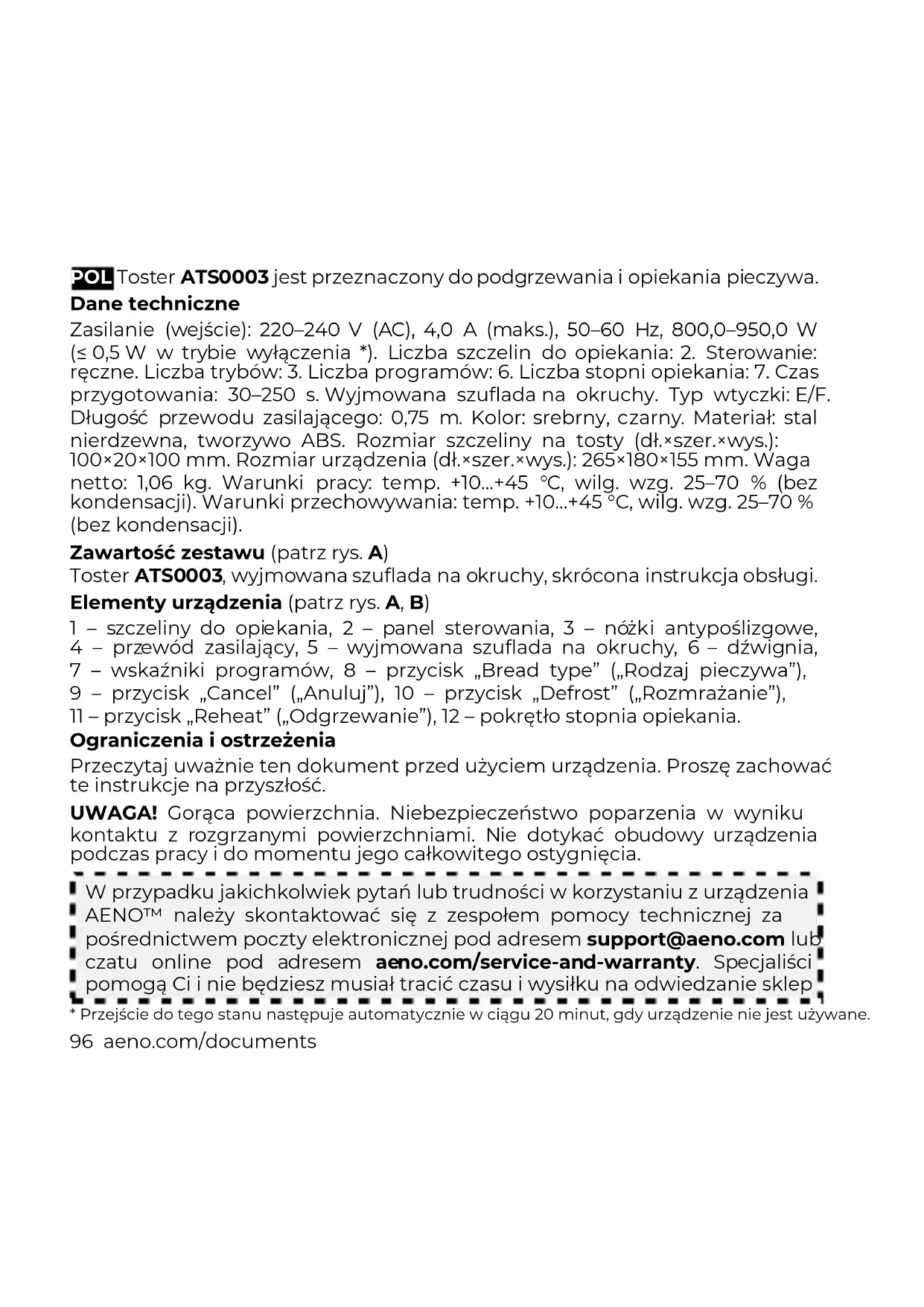 deze vervolgens droog. Probleemoplossing Het apparaat werkt niet. Mogelijke oorzaak: defect stopcontact; defect netsnoer. Oplossing: controleer of het stopcontact correct werkt; neem contact op met een erkend servicecentrum. De hendel vergrendelt niet in de onderste stand. Mogelijke oorzaak: het apparaat is niet aangesloten op een voedingsbron. Oplossing: sluit het apparaat aan op een voedingsbron. Het brood brandt aan. Mogelijke oorzaken: het verkeerde programma of de verkeerde bruiningsgraad is gekozen; een snee brood is vervormd of er zit beleg op; de kruimellade is vol. Oplossing: kies het juiste programma met de knop (7) of de bruiningsgraad met de regelaar (12); gebruik geen vervormd brood of brood met beleg erop; reinig de kruimellade (zie 'Reiniging en onderhoud'). De toast zit vast. Mogelijke reden: de snee brood is te groot. Oplossing: haal de stekker uit het stopcontact en verwijder de toast met een siliconen of kunststof keukentang. ATTENTIE! Gebruik geen metalen voorwerpen (messen, vorken, lepels, enz.) om de toast te verwijderen. ATTENTIE! Als geen van de voorgestelde methoden helpt om het probleem op te lossen, neem dan contact op met uw leverancier of een erkend servicecentrum. Haal het apparaat niet uit elkaar en probeer het niet zelf te repareren.96 aeno.com/documents POL Toster ATS0003 jest przeznaczony do podgrzewania i opiekania pieczywa. Dane techniczne Zasilanie (wejście): 220–240 V (AC), 4,0 A (maks.), 50–60 Hz, 800,0–950,0 W (≤ 0,5 W w trybie wyłączenia *). Liczba szczelin do opiekania: 2. Sterowanie: ręczne. Liczba trybów: 3. Liczba programów: 6. Liczba stopni opiekania: 7. Czas przygotowania: 30–250 s. Wyjmowana szuflada na okruchy. Typ wtyczki: E/F. Długość przewodu zasilającego: 0,75 m. Kolor: srebrny, czarny. Materiał: stal nierdzewna, tworzywo ABS. Rozmiar szczeliny na tosty (dł.×szer.×wys.): 100×20×100 mm. Rozmiar urządzenia (dł.×szer.×wys.): 265×180×155 mm. Waga netto: 1,06 kg. Warunki pracy: temp. +10…+45 °C, wilg. wzg. 25–70 % (bez kondensacji). Warunki przechowywania: temp. +10…+45 °C, wilg. wzg. 25–70 % (bez kondensacji). Zawartość zestawu (patrz rys. A) Toster ATS0003, wyjmowana szuflada na okruchy, skrócona instrukcja obsługi. Elementy urządzenia (patrz rys. A, B) 1 – szczeliny do opiekania, 2 – panel sterowania, 3 – nóżki antypoślizgowe, 4 – przewód zasilający, 5 – wyjmowana szuflada na okruchy, 6 – dźwignia, 7 – wskaźniki programów, 8 – przycisk „Bread type” („Rodzaj pieczywa”), 9 – przycisk „Cancel” („Anuluj”), 10 – przycisk „Defrost” („Rozmrażanie”), 11 – przycisk „Reheat” („Odgrzewanie”), 12 – pokrętło stopnia opiekania. Ograniczenia i ostrzeżenia Przeczytaj uważnie ten dokument przed użyciem urządzenia. Proszę zachować te instrukcje na przyszłość. UWAGA! Gorąca powierzchnia. Niebezpieczeństwo poparzenia w wyniku kontaktu z rozgrzanymi powierzchniami. Nie dotykać obudowy urządzenia podczas pracy i do momentu jego całkowitego ostygnięcia.