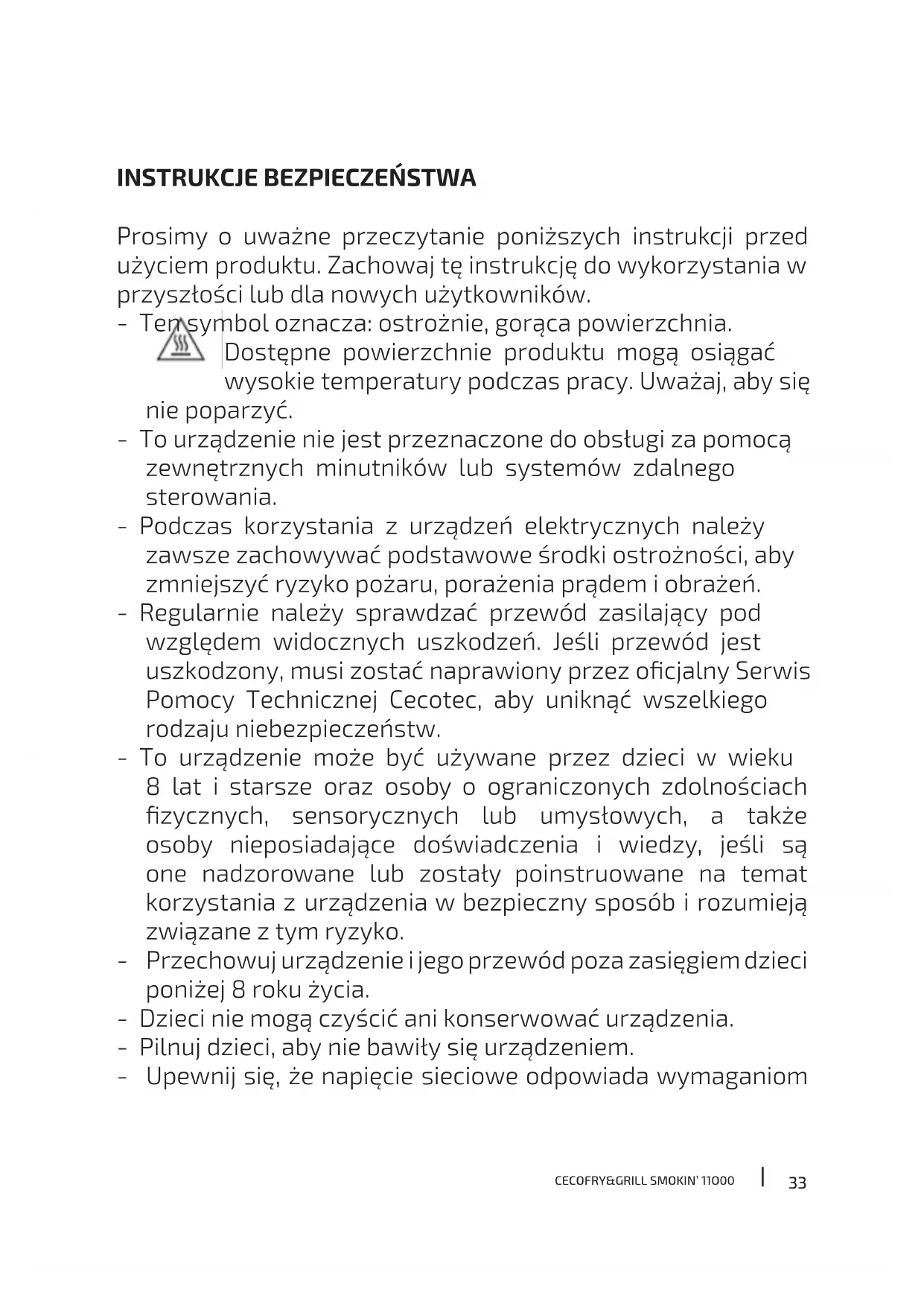 Prosimy o uważne przeczytanie poniższych instrukcji przed użyciem produktu. Zachowaj tę instrukcję do wykorzystania w przyszłości lub dla nowych użytkowników. - Ten symbol oznacza: ostrożnie, gorąca powierzchnia. Dostępne powierzchnie produktu mogą osiągać wysokie temperatury podczas pracy. Uważaj, aby się nie poparzyć. - To urządzenie nie jest przeznaczone do obsługi za pomocą zewnętrznych minutników lub systemów zdalnego sterowania. - Podczas korzystania z urządzeń elektrycznych należy zawsze zachowywać podstawowe środki ostrożności, aby zmniejszyć ryzyko pożaru, porażenia prądem i obrażeń. - Regularnie należy sprawdzać przewód zasilający pod względem widocznych uszkodzeń. Jeśli przewód jest uszkodzony, musi zostać naprawiony przez ocjalny Serwis Pomocy Technicznej Cecotec, aby uniknąć wszelkiego rodzaju niebezpieczeństw. - To urządzenie może być używane przez dzieci w wieku 8 lat i starsze oraz osoby o ograniczonych zdolnościach zycznych, sensorycznych lub umysłowych, a także osoby nieposiadające doświadczenia i wiedzy, jeśli są one nadzorowane lub zostały poinstruowane na temat korzystania z urządzenia w bezpieczny sposób i rozumieją związane z tym ryzyko. - Przechowuj urządzenie i jego przewód poza zasięgiem dzieci poniżej 8 roku życia. - Dzieci nie mogą czyścić ani konserwować urządzenia. - Pilnuj dzieci, aby nie bawiły się urządzeniem. - Upewnij się, że napięcie sieciowe odpowiada wymaganiomCECOFRY&GRILL SMOKIN’ 11O00