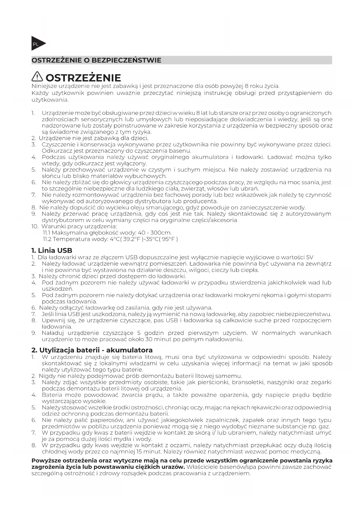 chłodnej wody przez co najmniej 15 minut. Należy również natychmiast wezwać pomoc medyczną. Powyższe ostrzeżenia oraz wytyczne mają na celu przede wszystkim ograniczenie powstania ryzyka zagrożenia życia lub powstawaniu ciężkich urazów. Właściciele basenów/spa powinni zawsze zachować szczególną ostrożność i zdrowy rozsądek podczas pracowania z urządzeniem.PL
