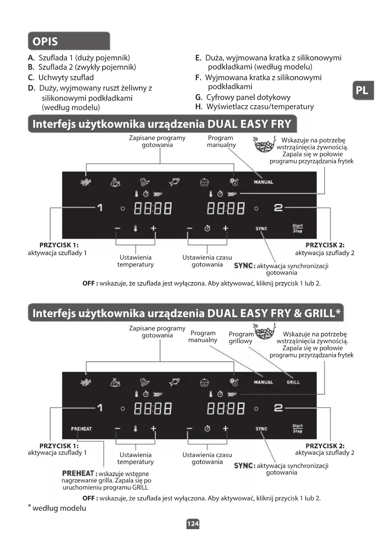 OPIS A. Szuflada 1 (duży pojemnik) B. Szuflada 2 (zwykły pojemnik) C. Uchwyty szuflad D. Duży, wyjmowany ruszt żeliwny z silikonowymi podkładkami (według modelu) E. Duża, wyjmowana kratka z silikonowymi podkładkami (według modelu) F. Wyjmowana kratka z silikonowymi podkładkami G. Cyfrowy panel dotykowy H. Wyświetlacz czasu/temperatury Interfejs użytkownika urządzenia DUAL EASY FRY Interfejs użytkownika urządzenia DUAL EASY FRY & GRILL* OFF : wskazuje, że szuflada jest wyłączona. Aby aktywować, kliknij przycisk 1 lub 2. OFF : wskazuje, że szuflada jest wyłączona. Aby aktywować, kliknij przycisk 1 lub 2. : wskazuje wstępne nagrzewanie grilla. Zapala się po uruchomieniu programu GRILL