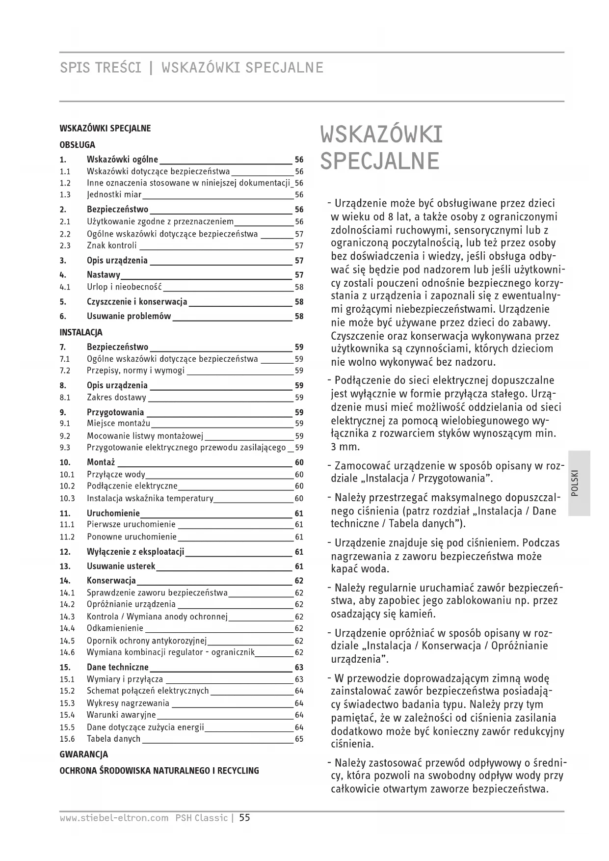 : . , .4, . 2 129343, . , . +7 495 125 0 125 info@stiebel-eltron.ru www.stiebel-eltron.ruPOLSKI www.stiebel-eltron.com PSH Classic | 55 SPiS TReŚCi | WSkAzóWki SPeCjALne WSkAzóWki SPeCjALne - Urządzenie może być obsługiwane przez dzieci w wieku od 8 lat, a także osoby z ograniczonymi zdolnościami ruchowymi, sensorycznymi lub z ograniczoną poczytalnością, lub też przez osoby bez doświadczenia i wiedzy, jeśli obsługa odby- wać się będzie pod nadzorem lub jeśli użytkowni- cy zostali pouczeni odnośnie bezpiecznego korzy- stania z urządzenia i zapoznali się z ewentualny- mi grożącymi niebezpieczeństwami. Urządzenie nie może być używane przez dzieci do zabawy. Czyszczenie oraz konserwacja wykonywana przez użytkownika są czynnościami, których dzieciom nie wolno wykonywać bez nadzoru. - Podłączenie do sieci elektrycznej dopuszczalne jest wyłącznie wformie przyłącza stałego. Urzą- dzenie musi mieć możliwość oddzielania od sieci elektrycznej za pomocą wielobiegunowego wy- łącznika z rozwarciem styków wynoszącym min. 3 mm. - Zamocować urządzenie w sposób opisany w roz- dziale „Instalacja/ Przygotowania”. - Należy przestrzegać maksymalnego dopuszczal- nego ciśnienia (patrz rozdział „Instalacja/ Dane techniczne/ Tabela danych”). - Urządzenie znajduje się pod ciśnieniem. Podczas nagrzewania zzaworu bezpieczeństwa może kapać woda. - Należy regularnie uruchamiać zawór bezpieczeń- stwa, aby zapobiec jego zablokowaniu np. przez osadzający się kamień. - Urządzenie opróżniać w sposób opisany w roz- dziale „Instalacja/ Konserwacja/ Opróżnianie urządzenia”. - W przewodzie doprowadzającym zimną wodę zainstalować zawór bezpieczeństwa posiadają- cy świadectwo badania typu. Należy przy tym pamiętać, że w zależności od ciśnienia zasilania dodatkowo może być konieczny zawór redukcyjny ciśnienia. - Należy zastosować przewód odpływowy o średni- cy, która pozwoli na swobodny odpływ wody przy całkowicie otwartym zaworze bezpieczeństwa.
