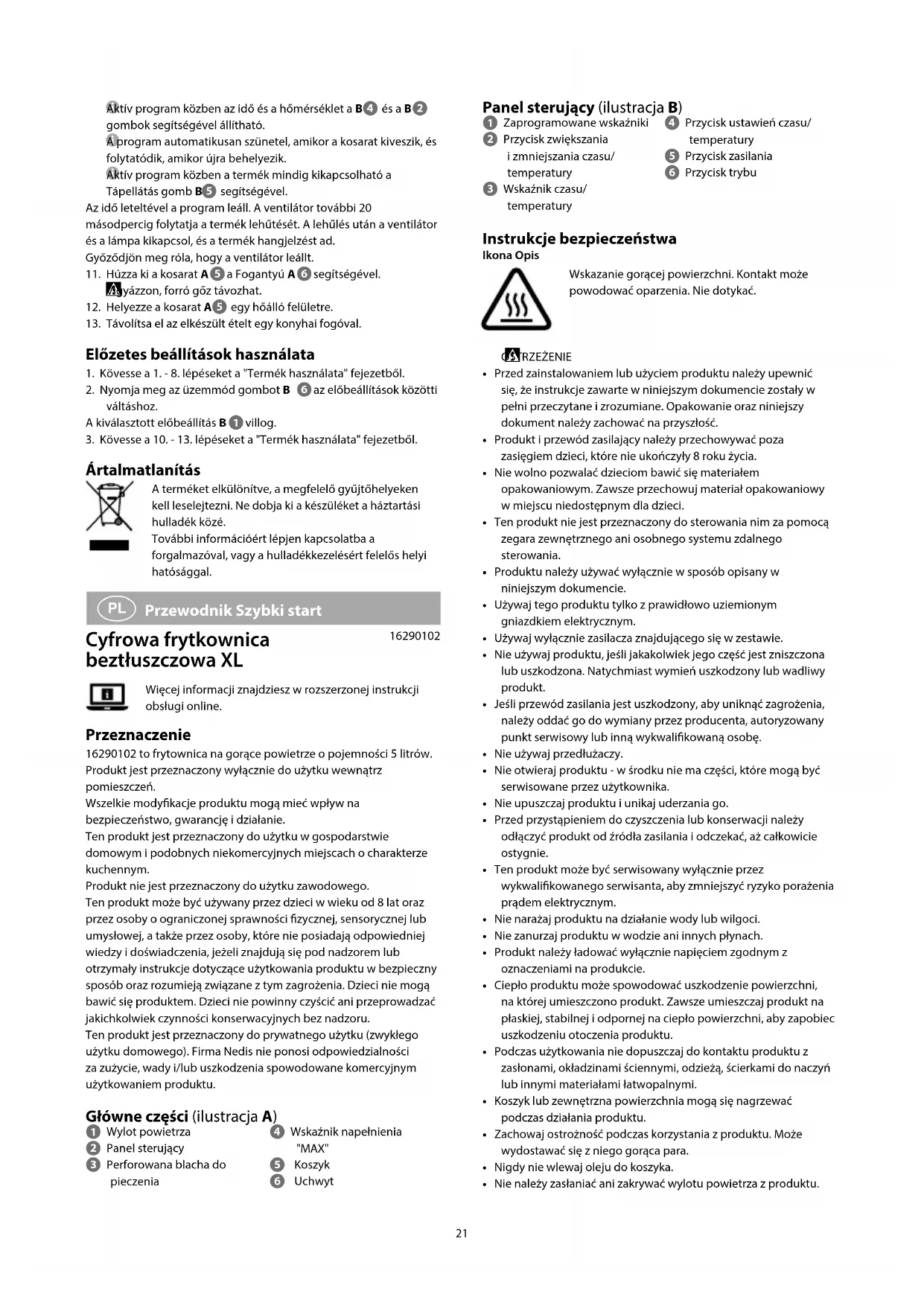 Οδηγός γρήγορης εκκίνησης Ψηφιακή φριτέζα θερμού αέρα XL 16290102Για περισσότερες πληροφορίες δείτε το εκτενές online εγχειρίδιο. Προοριζόμενη χρήση Οι 16290102 είναι μια φριτέζα θερμού αέρα με χωρητικότητα 5 λίτρων.Το προϊόν αυτό προορίζεται αποκλειστικά για εσωτερικό χώρο.Οποιαδήποτε τροποποίηση του προϊόντος μπορεί να έχει επιπτώσεις στην ασφάλεια, την εγγύηση και τη σωστή λειτουργία.Το προϊόν προορίζεται αποκλειστικά για το σπίτι και παρόμοιους χώρους όπως μια κουζίνα.Το προϊόν δεν πρέπει χρησιμοποιείται για επαγγελματική χρήση.Το προϊόν αυτό μπορεί να χρησιμοποιηθεί από παιδιά 8 ετών και άνω και από άτομα με μειωμένες σωματικές, αισθητηριακές ή διανοητικές ικανότητες ή χωρίς εμπειρία και γνώσεις αν επιβλέπονται ή τους έχουν δοθεί οδηγίες για την ασφαλή χρήση του προϊόντος και κατανοούν τους κίνδυνους που εμπλέκονται. Τα παιδιά δεν πρέπει να παίζουν με το προϊόν. Η καθαριότητα και η συντήρηση από τον χρήστη δεν πρέπει να πραγματοποιείται από παιδιά χωρίς επίβλεψη.Το προϊόν έχει σχεδιαστεί αποκλειστικά για προσωπική χρήση (τυπική οικιακή χρήση). Το Nedis δεν ευθύνεται για τυχόν φθορές, ελαττώματα ή/και βλάβες οι οποίες προκαλούνται από την εμπορική χρήση του προϊόντος.• Jeśli wystąpią problemy, odłącz produkt od źródła zasilania i innych urządzeń.• Nie podłączaj ani nie odłączaj zasilacza mokrymi rękoma.• Nie odłączaj produktu, ciągnąc za kabel. Zawsze należy chwycić wtyczkę i pociągnąć ją.• Przewód zasilania nie powinien zwisać przez brzeg stołu lub blatu ani dotykać gorącej powierzchni.• Korzystanie z akcesoriów niezalecanych przez producenta może spowodować pożar, porażenie prądem lub obrażenia ciała.• Nie zostawiaj włączonego produktu bez nadzoru.• Przed rozpoczęciem sprzątania odłącz produkt od źródła zasilania.• Przed przystąpieniem do czyszczenia pozostaw produkt do ostygnięcia.• Do czyszczenia produktu nie używaj agresywnych chemicznych środków czyszczących.• Dzieci nie powinny czyścić ani przeprowadzać jakichkolwiek czynności konserwacyjnych bez nadzoru.• Pozostaw produkt do ostygnięcia przed schowaniem.• Nie dotykaj gorących części produktu bezpośrednio.• Należy używać wyłącznie form do pieczenia lub naczyń do piekarnika, które mieszczą się w koszyku na produkty, pozostawiając wolną przestrzeń wokół boków, aby umożliwić prawidłową cyrkulację powietrza. Przed pierwszym użyciem 1. Usuń wszystkie opakowania z zewnętrznej i wewnętrznej strony produktu.2. Wszystkie części mające kontakt z żywnością należy czyścić gorącą wodą z dodatkiem płynu do naczyń. Zapobieganie przedostawaniu się wody do uchwytu A lub przedniego panelu koszyka.3. Zewnętrzną powierzchnię produktu czyść miękką, czystą i lekko wilgotną ściereczką. Nie zanurzaj produktu w wodzie dla celów czyszczenia.4. Skorzystaj z instrukcji zawartych w rozdziale "Korzystanie z produktu", aby wykonać co najmniej jeden cykl podgrzewania, gdy produkt jest pusty. Gdy produkt nagrzewa się po raz pierwszy, może wyemitować niewielką ilość dymu lub zapach. Jest to normalne i nie wpływa na bezpieczeństwo produktu. Użytkowanie produktu