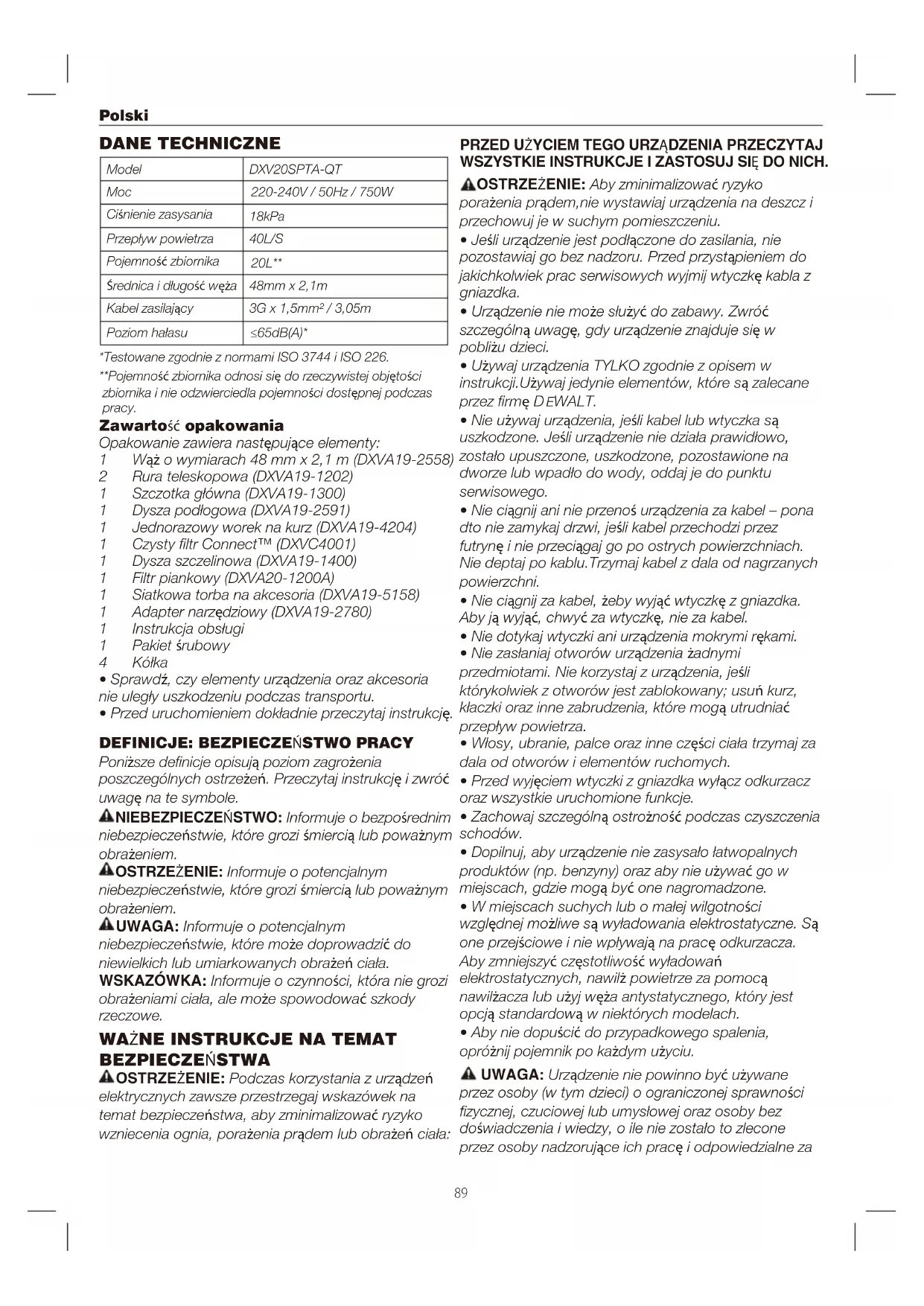 ΕΓΓΥΗΣΗ ΕΡΓΑΛΕΙΟΥ89 Polski DANE TECHNICZNE 220-240V / 50Hz / 750W 18kPa 20L** 48mm x 2,1m 3G x 1,5mm² / 3,05m ≤65dB(A)* *Testowane zgodnie z normami ISO 3744 i ISO 226. **Pojemność zbiornika odnosi się do rzeczywistej objętości zbiornika i nie odzwierciedla pojemności dostępnej podczas pracy. 40L/S DXV20SPTA-QT Moc Ciśnienie zasysania Przepływ powietrza Pojemność zbiornika Średnica i długość węża Kabel zasilający Model Poziom hałasu Zawartość opakowania Opakowanie zawiera następujące elementy: 1 Wąż o wymiarach 48 mm x 2,1 m (DXVA19-2558) 2 Rura teleskopowa (DXVA19-1202) 1 Szczotka główna (DXVA19-1300) 1 Dysza podłogowa (DXVA19-2591) 1 Jednorazowy worek na kurz (DXVA19-4204) 1 Czysty ltr Connect™ (DXVC4001) 1 Dysza szczelinowa (DXVA19-1400) 1 Filtr piankowy (DXVA20-1200A) 1 Siatkowa torba na akcesoria (DXVA19-5158) 1 Adapter narzędziowy (DXVA19-2780) 1 Instrukcja obsługi 1 Pakiet śrubowy 4 Kółka