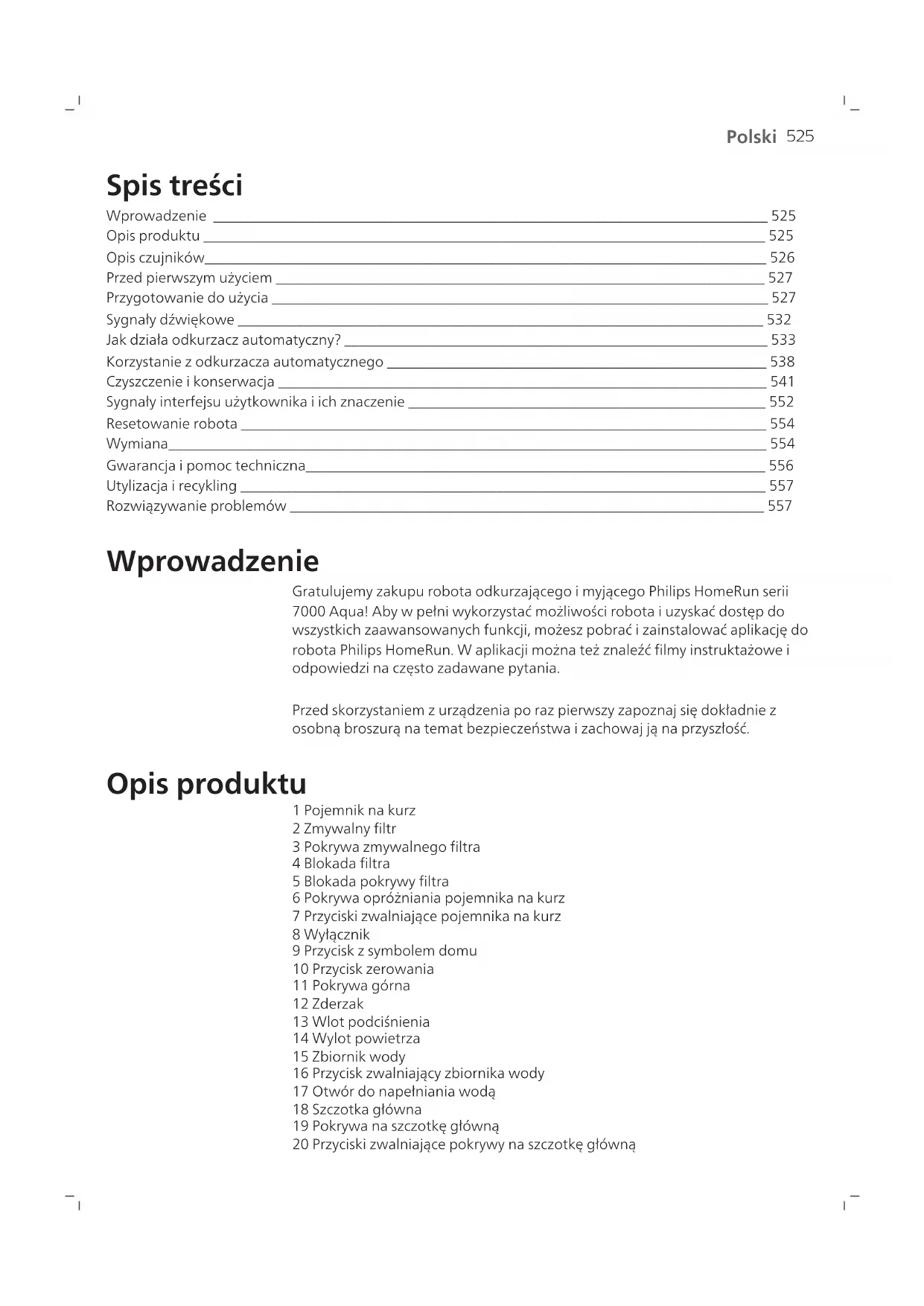 Polski Spis treści Wprowadzenie ____________________________________________________________________________ 525 Opis produktu _____________________________________________________________________________ 525 Opis czujników_____________________________________________________________________________ 526 Przed pierwszym użyciem ___________________________________________________________________ 527 Przygotowanie do użycia ____________________________________________________________________ 527 Sygnały dźwiękowe ________________________________________________________________________ 532 Jak działa odkurzacz automatyczny? __________________________________________________________ 533 Korzystanie z odkurzacza automatycznego ____________________________________________________ 538 Czyszczenie i konserwacja ___________________________________________________________________ 541 Sygnały interfejsu użytkownika i ich znaczenie _________________________________________________ 552 Resetowanie robota ________________________________________________________________________ 554 Wymiana__________________________________________________________________________________ 554 Gwarancja i pomoc techniczna_______________________________________________________________ 556 Utylizacja i recykling ________________________________________________________________________ 557 Rozwiązywanie problemów _________________________________________________________________ 557 Wprowadzenie Gratulujemy zakupu robota odkurzającego i myjącego Philips HomeRun serii 7000 Aqua! Aby w pełni wykorzystać możliwości robota i uzyskać dostęp do wszystkich zaawansowanych funkcji, możesz pobrać i zainstalować aplikację do robota Philips HomeRun. W aplikacji można też znaleźć filmy instruktażowe i odpowiedzi na często zadawane pytania. Przed skorzystaniem z urządzenia po raz pierwszy zapoznaj się dokładnie z osobną broszurą na temat bezpieczeństwa i zachowaj ją na przyszłość. Opis produktu 1 Pojemnik na kurz 2 Zmywalny filtr 3 Pokrywa zmywalnego filtra 4 Blokada filtra 5 Blokada pokrywy filtra 6 Pokrywa opróżniania pojemnika na kurz 7 Przyciski zwalniające pojemnika na kurz 8 Wyłącznik 9 Przycisk z symbolem domu 10 Przycisk zerowania 11 Pokrywa górna 12 Zderzak 13 Wlot podciśnienia 14 Wylot powietrza 15 Zbiornik wody 16 Przycisk zwalniający zbiornika wody 17 Otwór do napełniania wodą 18 Szczotka główna 19 Pokrywa na szczotkę główną 20 Przyciski zwalniające pokrywy na szczotkę główną526 Polski 21 Koła główne 22 Przednie koło samonastawne 23 Punkty styków ładowania (robota). 24 Szczotka boczna 25 Uchwyt na wkładki do mopa 26 Wkładka do mopa (2x) 27 Przewód zasilający (XU7000) 28 Stacja (ładująca) (XU7000) 29 Okno sygnału podczerwieni (XU7000) 30 Punkty styków ładowania (stacji) 31 Gniazdo przewodu zasilającego 32 Podkładka (XU7000) 33 Worek na kurz (2x) (XU7100) 34 Pokrywka pojemnika 35 Komora worka na kurz 36 Stacja automatycznego opróżniania (XU7100) 37 Kontrolka LED 38 Okno sygnału podczerwieni 39 Rampa 40 Wlot automatycznego opróżniania 41 Wylot powietrza automatycznego opróżniania 42 Punkty styków ładowania (stacji) 43 Otwór wentylacyjny układu wydechowego 44 Narzędzie do czyszczenia szczotek 45 Gniazdo przewodu zasilającego 46 Przewód zasilający (XU7100) Opis czujników