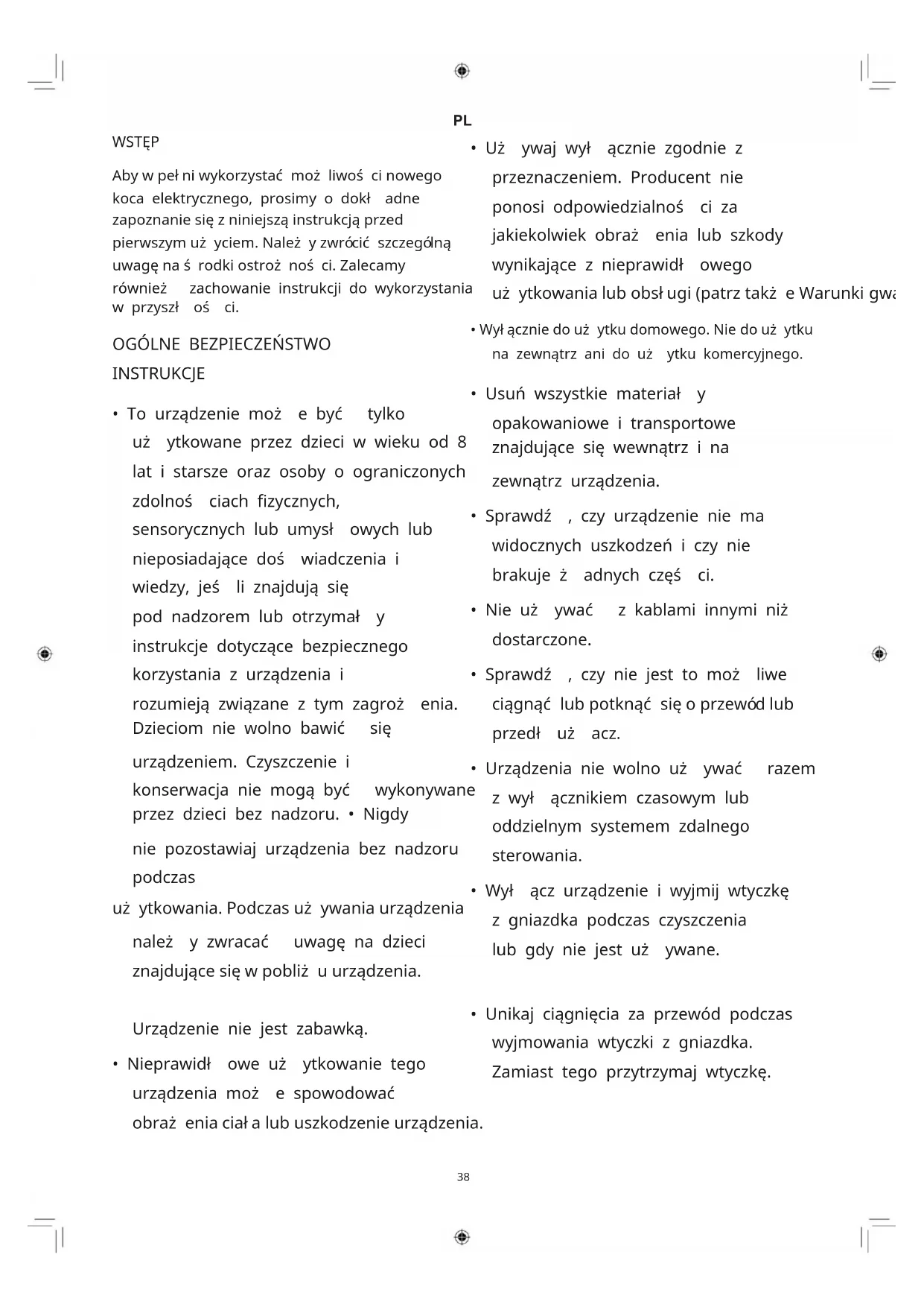 - Urządzenia nie wolno skł adać w ostre zał amania, prasować , zwijać , skręcać , ś ciskać ani manipulować w ż aden sposób, który mógł by uszkodzić wbudowane przewody grzejne.