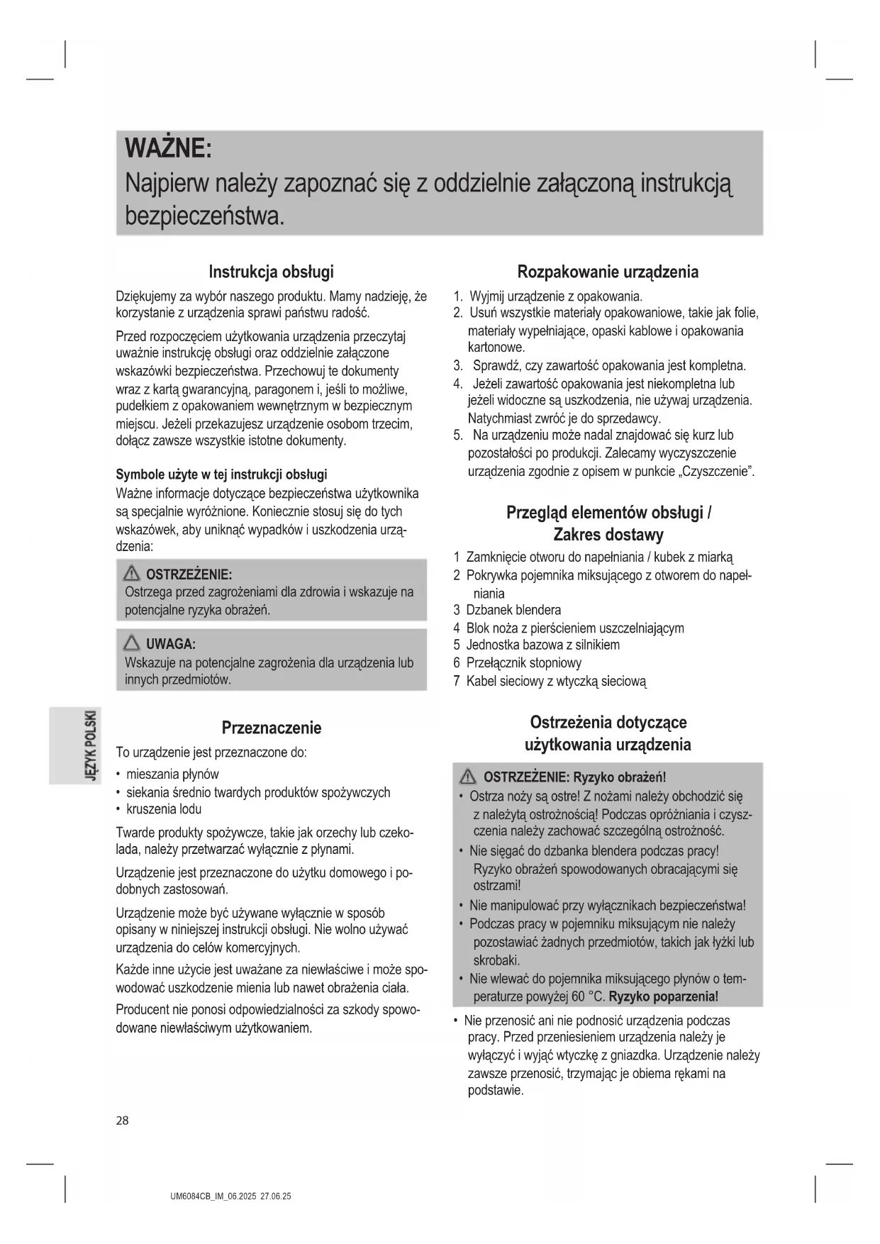 - Nie przenosić ani nie podnosić urządzenia podczas pracy. Przed przeniesieniem urządzenia należy je wyłączyć i wyjąć wtyczkę z gniazdka. Urządzenie należy zawsze przenosić, trzymając je obiema rękami na podstawie.UM6084CB_IM_06.2025 27.06.25