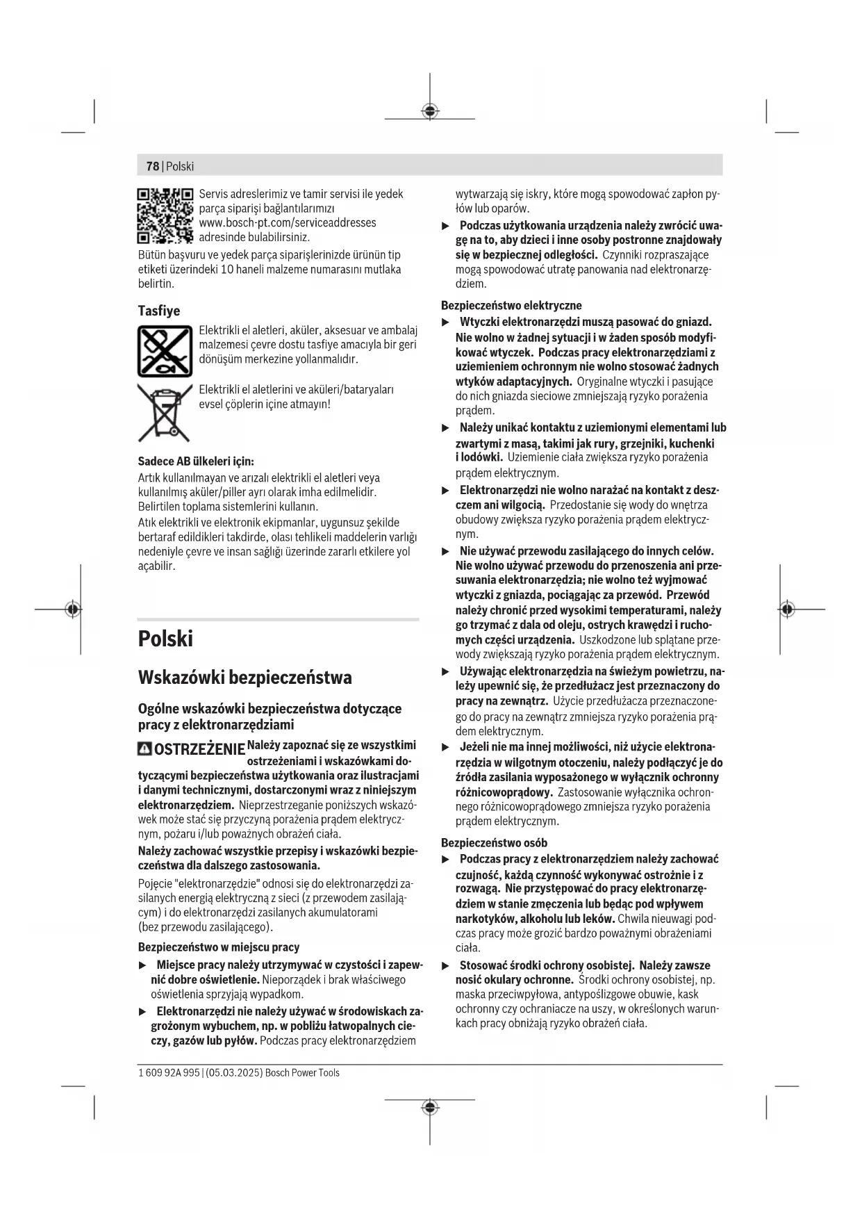 Karasoku Mahallesi 28028. Sokak No:20/A Merkez / ADANA Tel.: +903223599710 -3521379 Fax: +903223591323 E-mail: isiklar@isiklarelektrik.com Bosch Power Tools 1 609 92A 995 | (05.03.2025)78 | Polski Servis adreslerimiz ve tamir servisi ile yedek parça siparişi bağlantılarımızı www.bosch-pt.com/serviceaddresses adresinde bulabilirsiniz. Bütün başvuru ve yedek parça siparişlerinizde ürünün tip etiketi üzerindeki 10 haneli malzeme numarasını mutlaka belirtin. Tasfiye Elektrikli el aletleri, aküler, aksesuar ve ambalaj malzemesi çevre dostu tasfiye amacıyla bir geri dönüşüm merkezine yollanmalıdır. Elektrikli el aletlerini ve aküleri/bataryaları evsel çöplerin içine atmayın! Sadece AB ülkeleri için: Artık kullanılmayan ve arızalı elektrikli el aletleri veya kullanılmış aküler/piller ayrı olarak imha edilmelidir. Belirtilen toplama sistemlerini kullanın. Atık elektrikli ve elektronik ekipmanlar, uygunsuz şekilde bertaraf edildikleri takdirde, olası tehlikeli maddelerin varlığı nedeniyle çevre ve insan sağlığı üzerinde zararlı etkilere yol açabilir. Polski Wskazówki bezpieczeństwa Ogólne wskazówki bezpieczeństwa dotyczące pracy z elektronarzędziami OSTRZEŻENIE Należy zapoznać się ze wszystkimi ostrzeżeniami i wskazówkami do- tyczącymi bezpieczeństwa użytkowania oraz ilustracjami i danymi technicznymi, dostarczonymi wraz z niniejszym elektronarzędziem. Nieprzestrzeganie poniższych wskazó- wek może stać się przyczyną porażenia prądem elektrycz- nym, pożaru i/lub poważnych obrażeń ciała. Należy zachować wszystkie przepisy i wskazówki bezpie- czeństwa dla dalszego zastosowania. Pojęcie "elektronarzędzie" odnosi się do elektronarzędzi za- silanych energią elektryczną z sieci (z przewodem zasilają- cym) i do elektronarzędzi zasilanych akumulatorami (bezprzewodu zasilającego). Bezpieczeństwo w miejscu pracy u Miejsce pracy należy utrzymywać w czystości i zapew- nić dobre oświetlenie. Nieporządek i brak właściwego oświetlenia sprzyjają wypadkom. u Elektronarzędzi nie należy używać w środowiskach za- grożonym wybuchem, np. w pobliżu łatwopalnych cie- czy, gazów lub pyłów. Podczas pracy elektronarzędziem wytwarzają się iskry, które mogą spowodować zapłon py- łów lub oparów. u Podczas użytkowania urządzenia należy zwrócić uwa- gę na to, aby dzieci i inne osoby postronne znajdowały się w bezpiecznej odległości. Czynniki rozpraszające mogą spowodować utratę panowania nad elektronarzę- dziem. Bezpieczeństwo elektryczne u Wtyczki elektronarzędzi muszą pasować do gniazd. Nie wolno w żadnej sytuacji i w żaden sposób modyfi- kować wtyczek. Podczas pracy elektronarzędziami z uziemieniem ochronnym nie wolno stosować żadnych wtyków adaptacyjnych. Oryginalne wtyczki i pasujące do nich gniazda sieciowe zmniejszają ryzyko porażenia prądem. u Należy unikać kontaktu z uziemionymi elementami lub zwartymi z masą, takimi jak rury, grzejniki, kuchenki ilodówki. Uziemienie ciała zwiększa ryzyko porażenia prądem elektrycznym. u Elektronarzędzi nie wolno narażać na kontakt z desz- czem ani wilgocią. Przedostanie się wody do wnętrza obudowy zwiększa ryzyko porażenia prądem elektrycz- nym. u Nie używać przewodu zasilającego do innych celów. Nie wolno używać przewodu do przenoszenia ani prze- suwania elektronarzędzia; nie wolno też wyjmować wtyczki z gniazda, pociągając za przewód. Przewód należy chronić przed wysokimi temperaturami, należy go trzymać zdala od oleju, ostrych krawędzi i rucho- mych części urządzenia. Uszkodzone lub splątane prze- wody zwiększają ryzyko porażenia prądem elektrycznym. u Używając elektronarzędzia na świeżym powietrzu, na- leży upewnić się, że przedłużacz jest przeznaczony do pracy na zewnątrz. Użycie przedłużacza przeznaczone- go do pracy na zewnątrz zmniejsza ryzyko porażenia prą- dem elektrycznym. u Jeżeli nie ma innej możliwości, niż użycie elektrona- rzędzia w wilgotnym otoczeniu, należy podłączyć je do źródła zasilania wyposażonego w wyłącznik ochronny różnicowoprądowy. Zastosowanie wyłącznika ochron- nego różnicowoprądowego zmniejsza ryzyko porażenia prądem elektrycznym. Bezpieczeństwo osób u Podczas pracy z elektronarzędziem należy zachować czujność, każdą czynność wykonywać ostrożnie i z rozwagą. Nie przystępować do pracy elektronarzę- dziem w stanie zmęczenia lub będąc pod wpływem narkotyków, alkoholu lub leków. Chwila nieuwagi pod- czas pracy może grozić bardzo poważnymi obrażeniami ciała. u Stosować środki ochrony osobistej. Należy zawsze nosić okulary ochronne. Środki ochrony osobistej, np. maska przeciwpyłowa, antypoślizgowe obuwie, kask ochronny czy ochraniacze na uszy, w określonych warun- kach pracy obniżają ryzyko obrażeń ciała. 1 609 92A 995 | (05.03.2025) Bosch Power ToolsPolski | 79 u Należy unikać niezamierzonego uruchomienia narzę- dzia. Przed podłączeniem elektronarzędzia do źródła zasilania i/lub podłączeniem akumulatora, podniesie- niem albo transportem urządzenia, należy upewnić się, że włącznik elektronarzędzia znajduje się w pozy- cji wyłączonej. Przenoszenie elektronarzędzia z palcem opartym na włączniku/wyłączniku lub włożenie do gniaz- da sieciowego wtyczki włączonego narzędzia, może stać się przyczyną wypadków. u Przed włączeniem elektronarzędzia należy usunąć wszystkie narzędzia nastawcze i klucze maszynowe. Narzędzia lub klucze, pozostawione wruchomych czę- ściach urządzenia, mogą spowodować obrażenia ciała. u Należy unikać nienaturalnych pozycji przy pracy. Na- leży dbać o stabilną pozycję przy pracy i zachowanie równowagi. Dzięki temu można będzie łatwiej zapano- wać nad elektronarzędziem w nieprzewidzianych sytu- acjach. u Należy nosić odpowiednią odzież. Nie należy nosić luźnej odzieży ani biżuterii. Wł