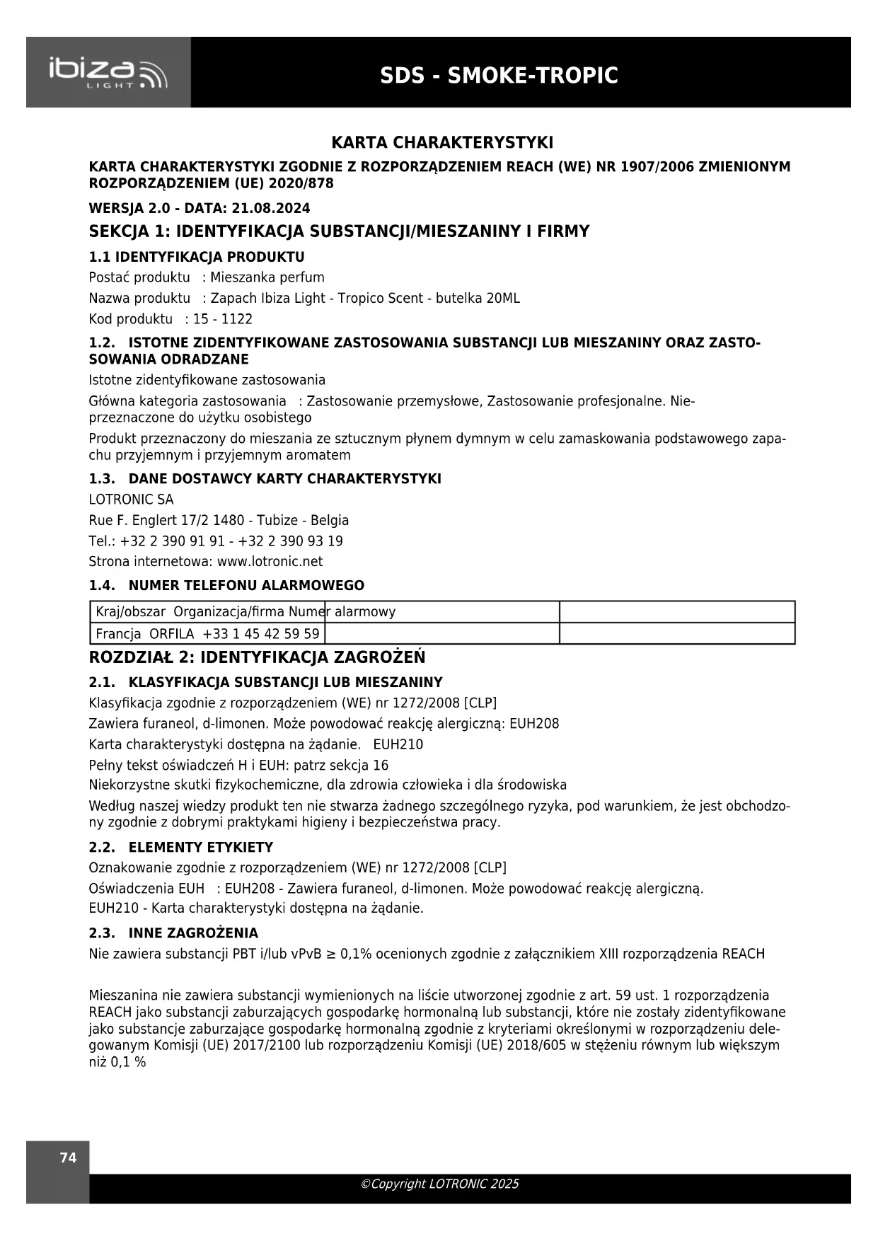 Postać produktu : Mieszanka perfum Nazwa produktu : Zapach Ibiza Light - Tropico Scent - butelka 20ML Kod produktu : 15 - 1122 1.2. ISTOTNE ZIDENTYFIKOWANE ZASTOSOWANIA SUBSTANCJI LUB MIESZANINY ORAZ ZASTO- SOWANIA ODRADZANE Istotne zidentykowane zastosowania Główna kategoria zastosowania : Zastosowanie przemysłowe, Zastosowanie profesjonalne. Nie- przeznaczone do użytku osobistego Produkt przeznaczony do mieszania ze sztucznym płynem dymnym w celu zamaskowania podstawowego zapa- chu przyjemnym i przyjemnym aromatem