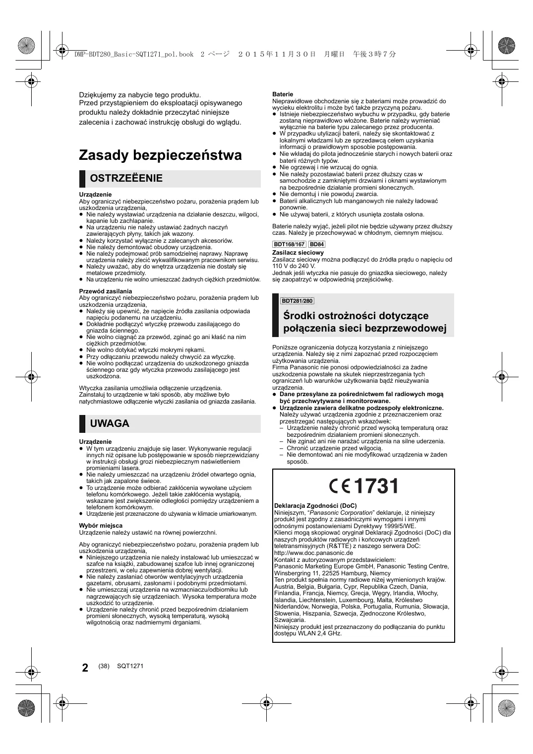 Magyar DMP-BDT281&280_Basic-SQT1271_hun.book 10 ページ DMP-BDT280_Basic-SQT1271_pol.book 2 ページ 2015年11月30日 Dziękujemy za nabycie tego produktu. Przed przystąpieniem do eksploatacji opisywanego produktu należy dokładnie przeczytać niniejsze zalecenia i zachować instrukcję obsługi do wglądu. Zasady bezpieczeństwa OSTRZEËENIE Urządzenie Aby ograniczyć niebezpieczeństwo pożaru, porażenia prądem lub uszkodzenia urządzenia, ≥ Nie należy wystawiać urządzenia na działanie deszczu, wilgoci, kapanie lub zachlapanie. ≥ Na urządzeniu nie należy ustawiać żadnych naczyń zawierających płyny, takich jak wazony. ≥ Należy korzystać wyłącznie z zalecanych akcesoriów. ≥ Nie należy demontować obudowy urządzenia. ≥ Nie należy podejmować prób samodzielnej naprawy. Naprawę urządzenia należy zlecić wykwalifikowanym pracownikom serwisu. ≥ Należy uważać, aby do wnętrza urządzenia nie dostały się metalowe przedmioty. ≥ Na urządzeniu nie wolno umieszczać żadnych ciężkich przedmiotów. Przewód zasilania Aby ograniczyć niebezpieczeństwo pożaru, porażenia prądem lub uszkodzenia urządzenia, ≥ Należy się upewnić, że napięcie źródła zasilania odpowiada napięciu podanemu na urządzeniu. ≥ Dokładnie podłączyć wtyczkę przewodu zasilającego do gniazda ściennego. ≥ Nie wolno ciągnąć za przewód, zginać go ani kłaść na nim ciężkich przedmiotów. ≥ Nie wolno dotykać wtyczki mokrymi rękami. ≥ Przy odłączaniu przewodu należy chwycić za wtyczkę. ≥ Nie wolno podłączać urządzenia do uszkodzonego gniazda ściennego oraz gdy wtyczka przewodu zasilającego jest uszkodzona. Wtyczka zasilania umożliwia odłączenie urządzenia. Zainstaluj to urządzenie w taki sposób, aby możliwe było natychmiastowe odłączenie wtyczki zasilania od gniazda zasilania. UWAGA Urządzenie ≥ W tym urządzeniu znajduje się laser. Wykonywanie regulacji innych niż opisane lub postępowanie w sposób nieprzewidziany w instrukcji obsługi grozi niebezpiecznym naświetleniem promieniami lasera. ≥ Nie należy umieszczać na urządzeniu źródeł otwartego ognia, takich jak zapalone świece. ≥ To urządzenie może odbierać zakłócenia wywołane użyciem telefonu komórkowego. Jeżeli takie zakłócenia wystąpią, wskazane jest zwiększenie odległości pomiędzy urządzeniem a telefonem komórkowym. ≥ Urządzenie jest przeznaczone do używania w klimacie umiarkowanym. Wybór miejsca Urządzenie należy ustawić na równej powierzchni. Aby ograniczyć niebezpieczeństwo pożaru, porażenia prądem lub uszkodzenia urządzenia, ≥ Niniejszego urządzenia nie należy instalować lub umieszczać w szafce na książki, zabudowanej szafce lub innej ograniczonej przestrzeni, w celu zapewnienia dobrej wentylacji. ≥ Nie należy zasłaniać otworów wentylacyjnych urządzenia gazetami, obrusami, zasłonami i podobnymi przedmiotami. ≥ Nie umieszczaj urządzenia na wzmacniaczu/odbiorniku lub nagrzewających się urządzeniach. Wysoka temperatura może uszkodzić to urządzenie. ≥ Urządzenie należy chronić przed bezpośrednim działaniem promieni słonecznych, wysoką temperaturą, wysoką wilgotnością oraz nadmiernymi drganiami.