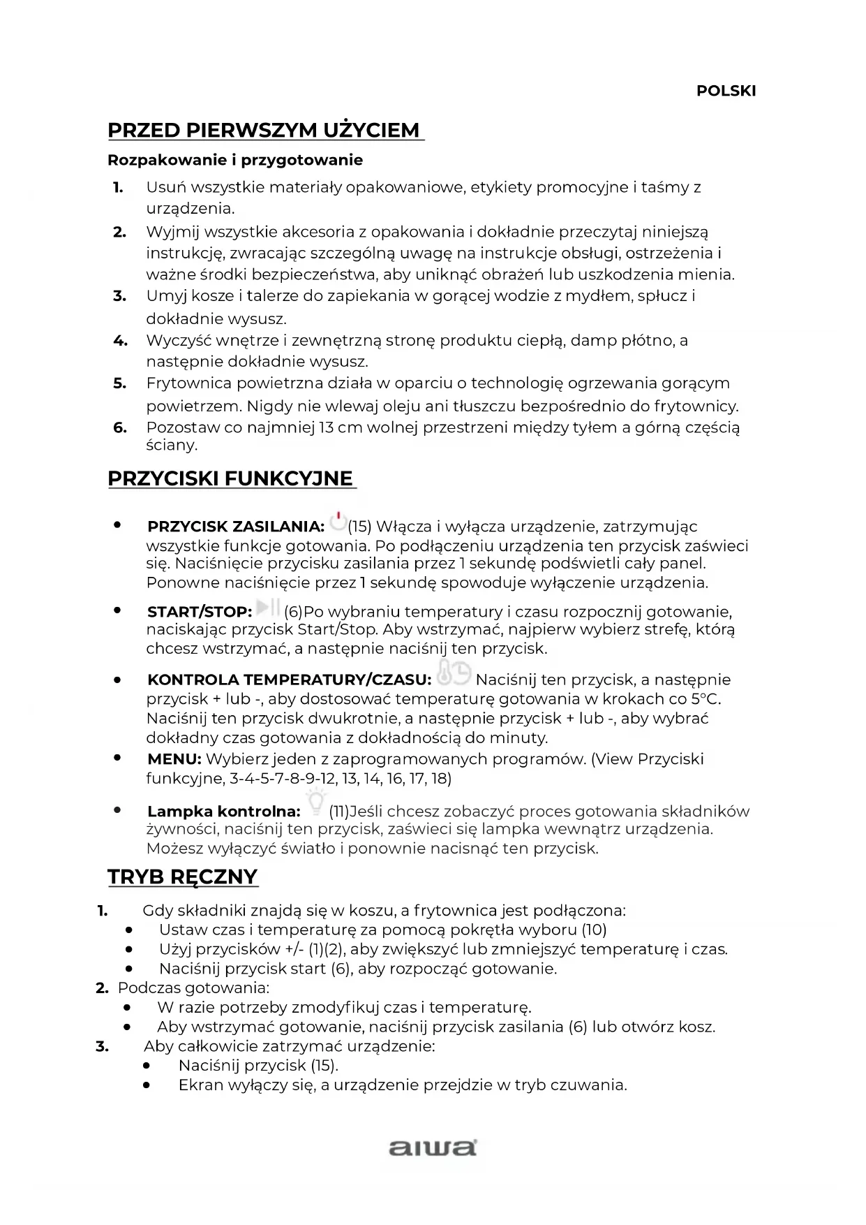 PRZYCISK ZASILANIA: (15) Włącza i wyłącza urządzenie, zatrzymując wszystkie funkcje gotowania. Po podłączeniu urzą dzenia ten przycisk zaświeci się. Naciśnięcie przycisku zasilania przez 1 sekundę podświetli cały panel. Ponowne naciśnięcie przez 1 sekundę spowoduje wyłączenie urządzenia.