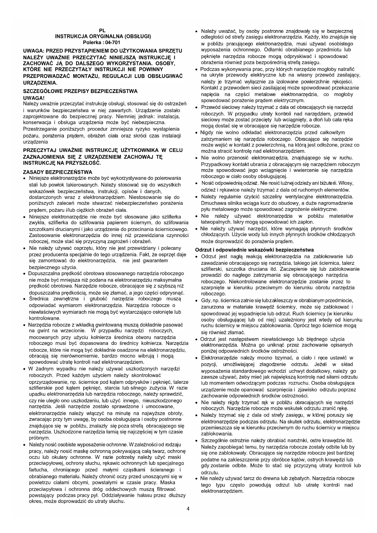 - Niniejsze elektronarzędzie może być wykorzystywane do polerowania stali lub powłok lakierowanych. Należy stosować się do wszystkich wskazówek bezpieczeństwa, instrukcji, opisów i danych, dostarczonych wraz z elektronarzędziem. Niestosowanie się do poniższych zaleceń może stwarzać niebezpieczeństwo porażenia prądem, pożaru i/lub ciężkich obrażeń ciała.
