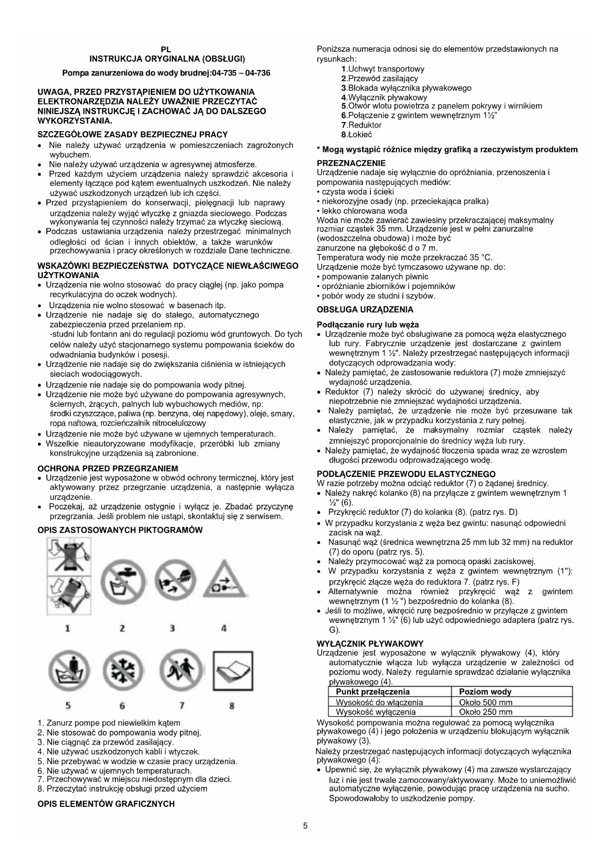 Poniższa numeracja odnosi się do elementów przedstawionych na rysunkach: 1.Uchwyt transportowy 2.Przewód zasilający 3.Blokada wyłącznika pływakowego 4.Wyłącznik pływakowy 5.Otwór wlotu powietrza z panelem pokrywy i wirnikiem 6.Połączenie z gwintem wewnętrznym 1½” 7.Reduktor 8.Łokieć