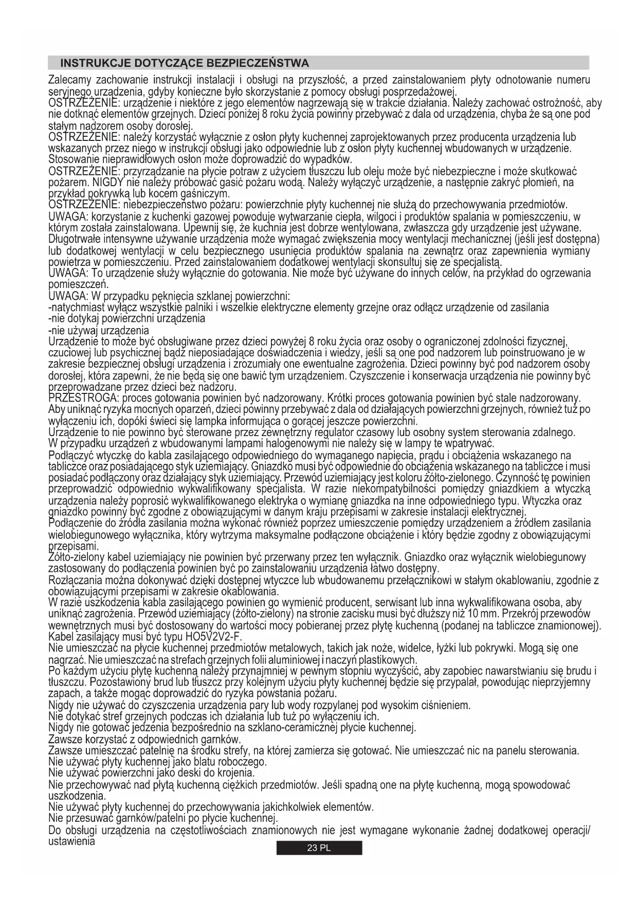 Cuando sea posible, use una tapa para cubrir la sartén. Regule la llama para que no se superponga al diámetro de la sartén.23 PL Zalecamy zachowanie instrukcji instalacji i obsługi na przyszłość, a przed zainstalowaniem płyty odnotowanie numeru seryjnego urządzenia, gdyby konieczne było skorzystanie z pomocy obsługi posprzedażowej. OSTRZEŻENIE: urządzenie i niektóre z jego elementów nagrzewają się w trakcie działania. Należy zachować ostrożność, aby nie dotknąć elementów grzejnych. Dzieci poniżej 8 roku życia powinny przebywać z dala od urządzenia, chyba że są one pod stałym nadzorem osoby dorosłej. OSTRZEŻENIE: należy korzystać wyłącznie z osłon płyty kuchennej zaprojektowanych przez producenta urządzenia lub wskazanych przez niego w instrukcji obsługi jako odpowiednie lub z osłon płyty kuchennej wbudowanych w urządzenie. Stosowanie nieprawidłowych osłon może doprowadzić do wypadków. OSTRZEŻENIE: przyrządzanie na płycie potraw z użyciem tłuszczu lub oleju może być niebezpieczne i może skutkować pożarem. NIGDY nie należy próbować gasić pożaru wodą. Należy wyłączyć urządzenie, a następnie zakryć płomień, na przykład pokrywką lub kocem gaśniczym. OSTRZEŻENIE: niebezpieczeństwo pożaru: powierzchnie płyty kuchennej nie służą do przechowywania przedmiotów. UWAGA: korzystanie z kuchenki gazowej powoduje wytwarzanie ciepła, wilgoci i produktów spalania w pomieszczeniu, w którym została zainstalowana. Upewnij się, że kuchnia jest dobrze wentylowana, zwłaszcza gdy urządzenie jest używane. Długotrwałe intensywne używanie urządzenia może wymagać zwiększenia mocy wentylacji mechanicznej (jeśli jest dostępna) lub dodatkowej wentylacji w celu bezpiecznego usunięcia produktów spalania na zewnątrz oraz zapewnienia wymiany powietrza w pomieszczeniu. Przed zainstalowaniem dodatkowej wentylacji skonsultuj się ze specjalistą. UWAGA: To urządzenie służy wyłącznie do gotowania. Nie może być używane do innych celów, na przykład do ogrzewania pomieszczeń. UWAGA: W przypadku pęknięcia szklanej powierzchni: -natychmiast wyłącz wszystkie palniki i wszelkie elektryczne elementy grzejne oraz odłącz urządzenie od zasilania -nie dotykaj powierzchni urządzenia -nie używaj urządzenia Urządzenie to może być obsługiwane przez dzieci powyżej 8 roku życia oraz osoby o ograniczonej zdolności fizycznej, czuciowej lub psychicznej bądź nieposiadające doświadczenia i wiedzy, jeśli są one pod nadzorem lub poinstruowano je w zakresie bezpiecznej obsługi urządzenia i zrozumiały one ewentualne zagrożenia. Dzieci powinny być pod nadzorem osoby dorosłej, która zapewni, że nie będą się one bawić tym urządzeniem. Czyszczenie i konserwacja urządzenia nie powinny być przeprowadzane przez dzieci bez nadzoru. PRZESTROGA: proces gotowania powinien być nadzorowany. Krótki proces gotowania powinien być stale nadzorowany. Aby uniknąć ryzyka mocnych oparzeń, dzieci powinny przebywać z dala od działających powierzchni grzejnych, również tuż po wyłączeniu ich, dopóki świeci się lampka informująca o gorącej jeszcze powierzchni. Urządzenie to nie powinno być sterowane przez zewnętrzny regulator czasowy lub osobny system sterowania zdalnego. W przypadku urządzeń z wbudowanymi lampami halogenowymi nie należy się w lampy te wpatrywać. Podłączyć wtyczkę do kabla zasilającego odpowiedniego do wymaganego napięcia, prądu i obciążenia wskazanego na tabliczce oraz posiadającego styk uziemiający. Gniazdko musi być odpowiednie do obciążenia wskazanego na tabliczce i musi posiadać podłączony oraz działający styk uziemiający. Przewód uziemiający jest koloru żółto-zielonego. Czynność tę powinien przeprowadzić odpowiednio wykwalifikowany specjalista. W razie niekompatybilności pomiędzy gniazdkiem a wtyczką urządzenia należy poprosić wykwalifikowanego elektryka o wymianę gniazdka na inne odpowiedniego typu. Wtyczka oraz gniazdko powinny być zgodne z obowiązującymi w danym kraju przepisami w zakresie instalacji elektrycznej. Podłączenie do źródła zasilania można wykonać również poprzez umieszczenie pomiędzy urządzeniem a źródłem zasilania wielobiegunowego wyłącznika, który wytrzyma maksymalne podłączone obciążenie i który będzie zgodny z obowiązującymi przepisami. Żółto-zielony kabel uziemiający nie powinien być przerwany przez ten wyłącznik. Gniazdko oraz wyłącznik wielobiegunowy zastosowany do podłączenia powinien być po zainstalowaniu urządzenia łatwo dostępny. Rozłączania można dokonywać dzięki dostępnej wtyczce lub wbudowanemu przełącznikowi w stałym okablowaniu, zgodnie z obowiązującymi przepisami w zakresie okablowania. W razie uszkodzenia kabla zasilającego powinien go wymienić producent, serwisant lub inna wykwalifikowana osoba, aby uniknąć zagrożenia. Przewód uziemiający (żółto-zielony) na stronie zacisku musi być dłuższy niż 10 mm. Przekrój przewodów wewnętrznych musi być dostosowany do wartości mocy pobieranej przez płytę kuchenną (podanej na tabliczce znamionowej). Kabel zasilający musi być typu HO5V2V2-F. Nie umieszczać na płycie kuchennej przedmiotów metalowych, takich jak noże, widelce, łyżki lub pokrywki. Mogą się one nagrzać. Nie umieszczać na strefach grzejnych folii aluminiowej i naczyń plastikowych. Po każdym użyciu płytę kuchenną należy przynajmniej w pewnym stopniu wyczyścić, aby zapobiec nawarstwianiu się brudu i tłuszczu. Pozostawiony brud lub tłuszcz przy kolejnym użyciu płyty kuchennej będzie się przypalał, powodując nieprzyjemny zapach, a także mogąc doprowadzić do ryzyka powstania pożaru. Nigdy nie używać do czyszczenia urządzenia pary lub wody rozpylanej pod wysokim ciśnieniem. Nie dotykać stref grzejnych podczas ich działania lub tuż po wyłączeniu ich. Nigdy nie gotować jedzenia bezpośrednio na szk