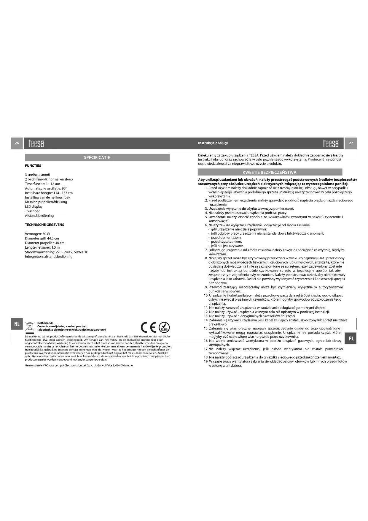 - SLEEP: Przy tej funkcji wentylator pracuje na drugim trybie mocy przez 30 minut, po czym zmienia tryb mocy na pierwszy i pozostaje w tym trybie do czasu wyłączenia urządzenia. Poland Prawidłowe usuwanie produktu (Zużyty sprzęt elektryczny i elektroniczny) Oznaczenie umieszczone na produkcie lub w odnoszących się do niego tekstach wskazuje, że po upływie okresu użytkowania nie należy usuwać z innymi odpadami pochodzącymi z gospodarstw domowych. Aby uniknąć szkodliwego wpływu na środowisko naturalne i zdrowie ludzi wskutek niekontrolowanego usuwania odpadów, prosimy o oddzielenie produktu od innego typu odpadów oraz odpowiedzialny recykling w celu promowania ponownego użycia zasobów materialnych jako stałej praktyki. W celu uzyskania informacji na temat miejsca i sposobu bezpiecznego dla środowiska recyklingu tego produktu użytkownicy w gospodarstwach domowych powinni skontaktować się z punktem sprzedaży detalicznej, w którym dokonali zakupu produktu, lub z organem władz lokalnych. Użytkownicy w rmach powinni skontaktować się ze swoim dostawcą i sprawdzić warunki umowy zakupu. Produktu nie należy usuwać razem z innymi odpadami komercyjnymi. Produktu nie należy usuwać razem z innymi odpadami komunalnymi. Taki sprzęt podlega selektywnej zbiórce i recyklingowi. Zawarte w nim szkodliwe substancje mogą powodować zanieczyszczenie środowiska i stanowić zagrożenie dla życia i zdrowia ludzi. Wyprodukowano w CHRL dla Lechpol Electronics Leszek Sp.k., ul. Garwolińska 1, 08-400 Miętne. SPECYFIKACJA FUNKCJE 3 tryby prędkości 2 tryby pracy: normal, sleep Funkcja Timera: 1 - 12 h Automatyczna oscylacja: 90° Regulowana wysokość: 114 - 137 cm Regulacja kąta nachylenia Metalowa osłona śmigła Wyświetlacz LED Panel dotykowy Sterowanie pilotem DANE TECHNICZNE Moc: 50 W Średnica grilla: 44,5 cm Średnica śmigła: 40 cm Długość kabla zasilającego: 1,5 m Zasilanie: 220 - 240 V, 50/60 Hz W zestawie: pilot zdalnego sterowania