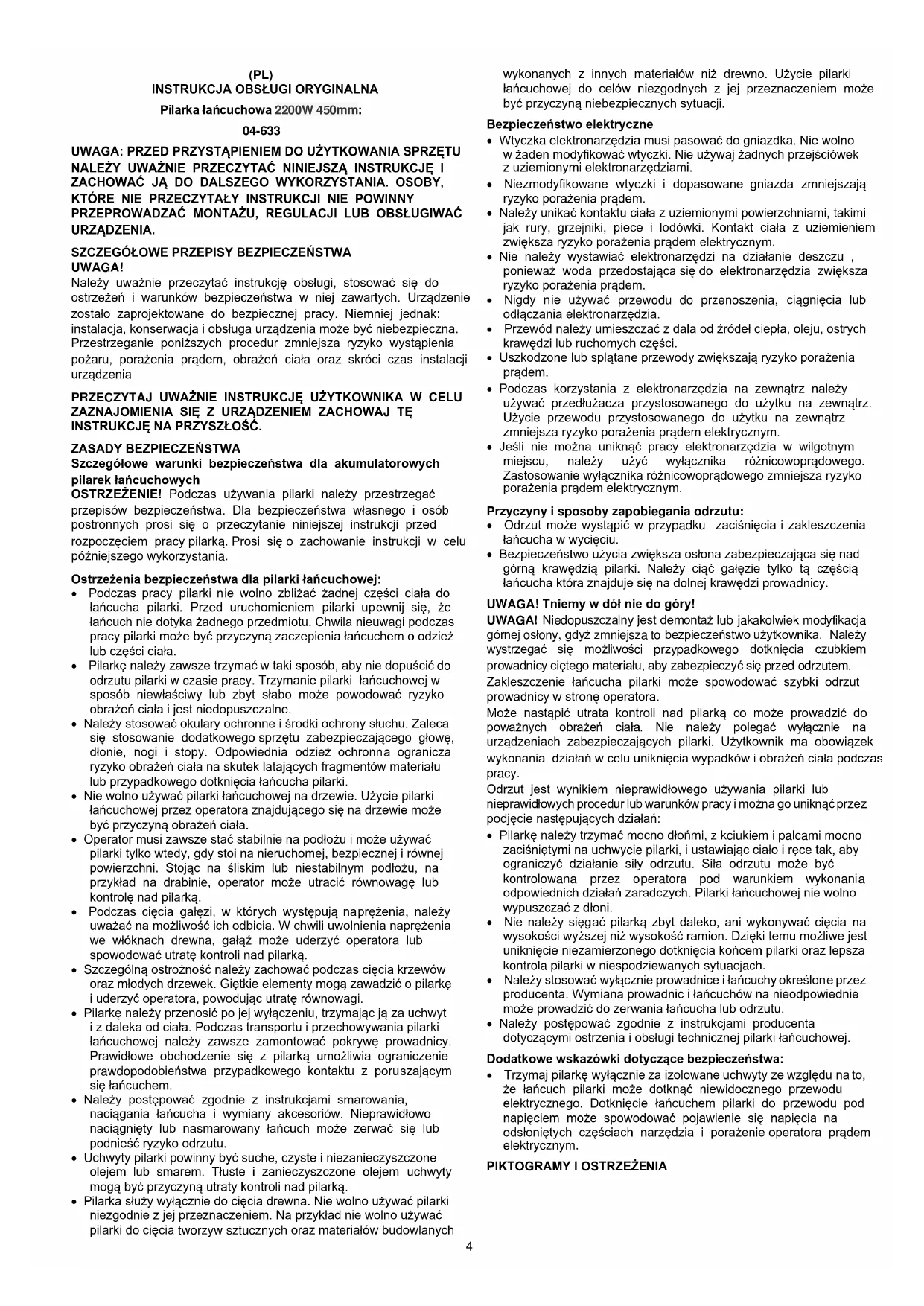 Szczegółowe warunki bezpieczeństwa dla akumulatorowych pilarek łańcuchowych OSTRZEŻENIE! Podczas używania pilarki należy przestrzegać przepisów bezpieczeństwa. Dla bezpieczeństwa własnego i osób postronnych prosi się o przeczytanie niniejszej instrukcji przed rozpoczęciem pracy pilarką. Prosi się o zachowanie instrukcji w celu późniejszego wykorzystania. Ostrzeżenia bezpieczeństwa dla pilarki łańcuchowej: