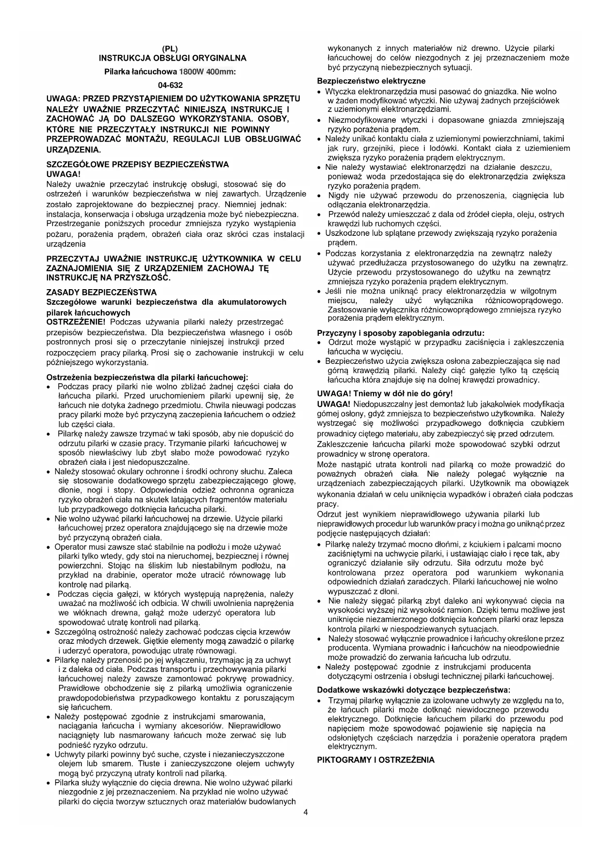 OSTRZEZENIE! Podczas uzywania pilarki nalezy przyestrzegać przepisów bezpieczenersstwa. Dla bezpieczenersstwa wlasngo i osob postronnych prosi sie o przyecztyanie niniejszej instrukcji przyrozpieczeciem pracy pilarka. Prosi sie o zachowanie instrukcji w celu poźniejszego wykorzystania.