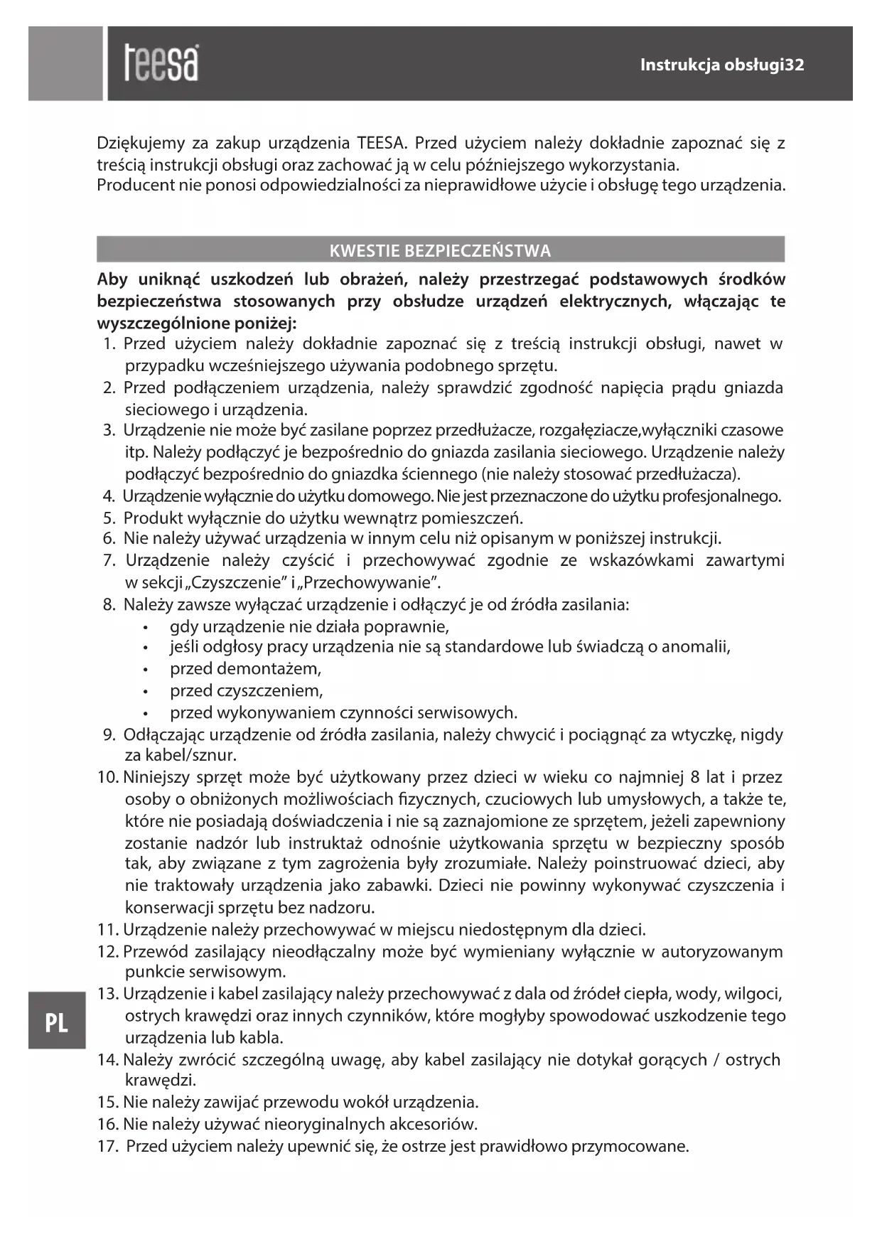 Dziekujemy za zakup urzadzenia TEESA. Przed uzyciem nalezy dokladnie zapoznać sie ztreścia instrukcji obshugi oraz zachować są w celu poźniejszego wykorzystania.