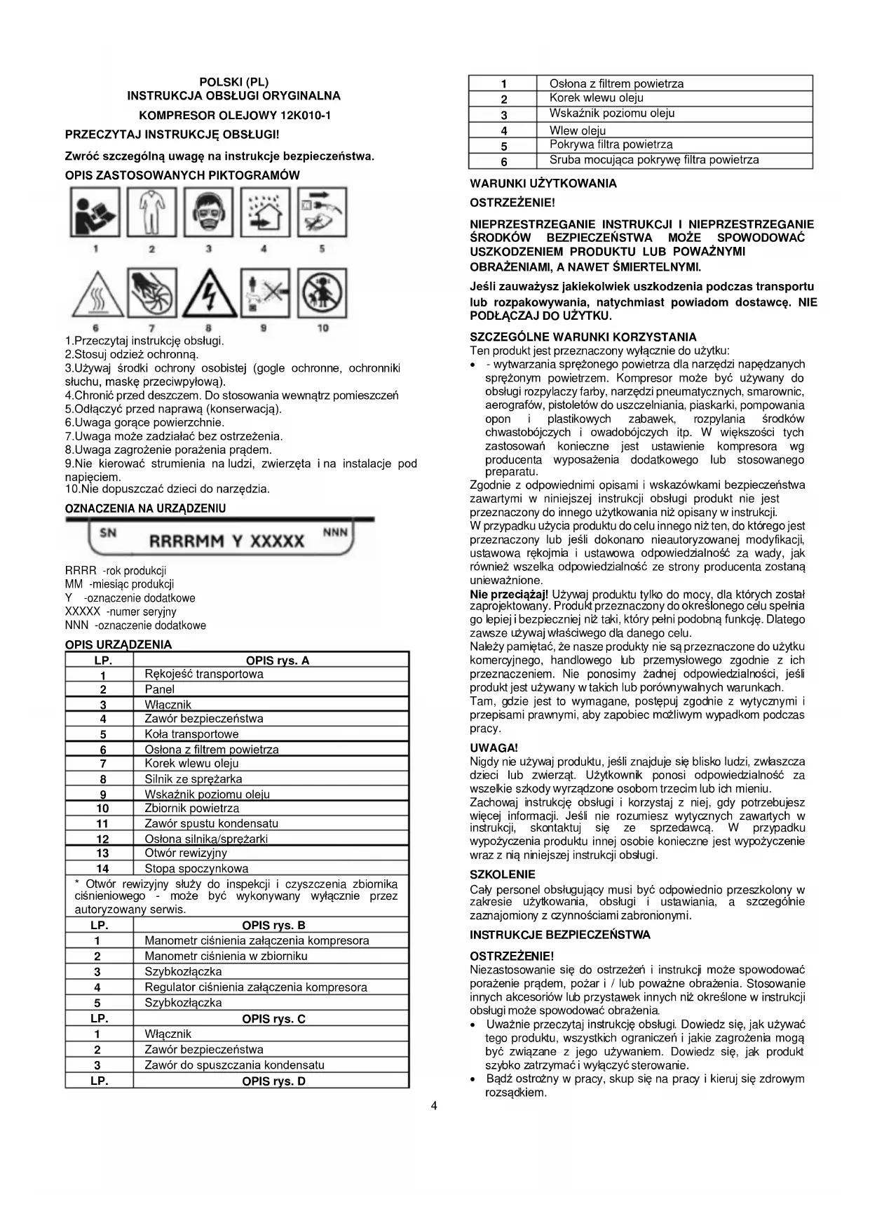 - - wytwarzania sprężonego powietrza dla narzędzi napędzanych sprężonym powietrzem. Kompresor może być używany do obsługi rozpylaczy farby, narzędzi pneumatycznych, smarownic, aerografów, pistoletów do uszczelniania, piaskarki, pompowania opon i plastikowych zabawek, rozpylania środków chwastobójczych i owadobójczych itp. W większości tych zastosowań konieczne jest ustawienie kompresora wg producenta wyposażenia dodatkowego lub stosowanego preparatu. Zgodnie z odpowiednimi opisami i wskazówkami bezpieczeństwa zawartymi w niniejszej instrukcji obsługi produkt nie jest przeznaczony do innego użytkowania niż opisany w instrukcji. W przypadku użycia produktu do celu innego niż ten, do którego jest przeznaczony lub jeśli dokonano nieautoryzowanej modyfikacji, ustawowa rękojmia i ustawowa odpowiedzialność za wady, jak również wszelka odpowiedzialność ze strony producenta zostaną unieważnione. Nie przeciążaj! Używaj produktu tylko do mocy, dla których został zaprojektowany. Produkt przeznaczony do określonego celu spełnia go lepiej i bezpieczniej niż taki, który pełni podobną funkcję. Dlatego zawsze używaj właściwego dla danego celu. Należy pamiętać, że nasze produkty nie są przeznaczone do użytku komercyjnego, handlowego lub przemysłowego zgodnie z ich przeznaczeniem. Nie ponosimy żadnej odpowiedzialności, jeśli produkt jest używany w takich lub porównywalnych warunkach. Tam, gdzie jest to wymagane, postępuj zgodnie z wytycznymi i przepisami prawnymi, aby zapobiec możliwym wypadkom podczas pracy. UWAGA! Nigdy nie używaj produktu, jeśli znajduje się blisko ludzi, zwłaszcza dzieci lub zwierząt. Użytkownik ponosi odpowiedzialność za wszelkie szkody wyrządzone osobom trzecim lub ich mieniu. Zachowaj instrukcję obsługi i korzystaj z niej, gdy potrzebujesz więcej informacji. Jeśli nie rozumiesz wytycznych zawartych w instrukcji, skontaktuj się ze sprzedawcą. W przypadku wypożyczenia produktu innej osobie konieczne jest wypożyczenie wraz z nią niniejszej instrukcji obsługi. SZKOLENIE Cały personel obsługujący musi być odpowiednio przeszkolony w zakresie użytkowania, obsługi i ustawiania, a szczególnie zaznajomiony z czynnościami zabronionymi.