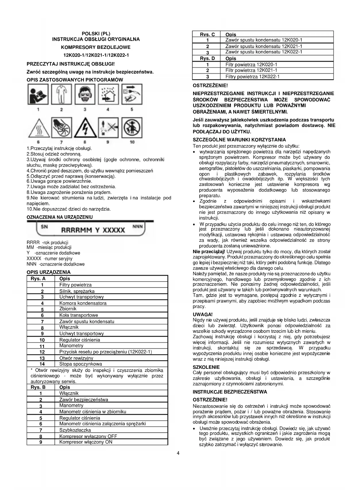 KOMPRESORY BEZOLEJOWE 12K020-1/12K021-1/12K022-1 PRZECZYTAJ INSTRUKCJĘ OBSŁUGI! Zwróć szczególną uwagę na instrukcje bezpieczeństwa.