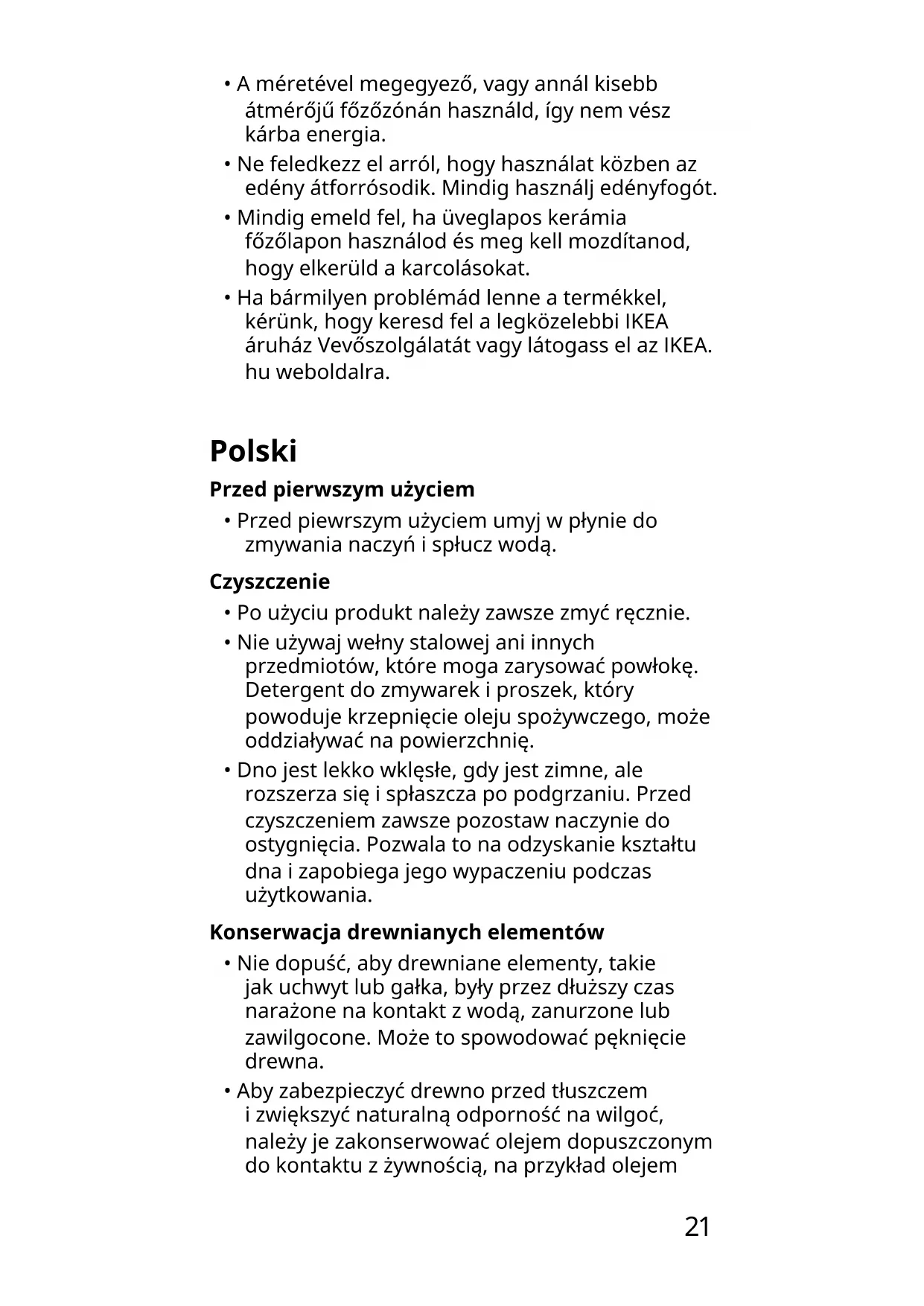 - Nie dopuść, aby drewniane elementy, takie jak uchwyt lub gałka, były przez dłuższy czas narażone na kontakt z wodą, zanurzone lub zawilgocone. Może to spowodować pęknięcie drewna.