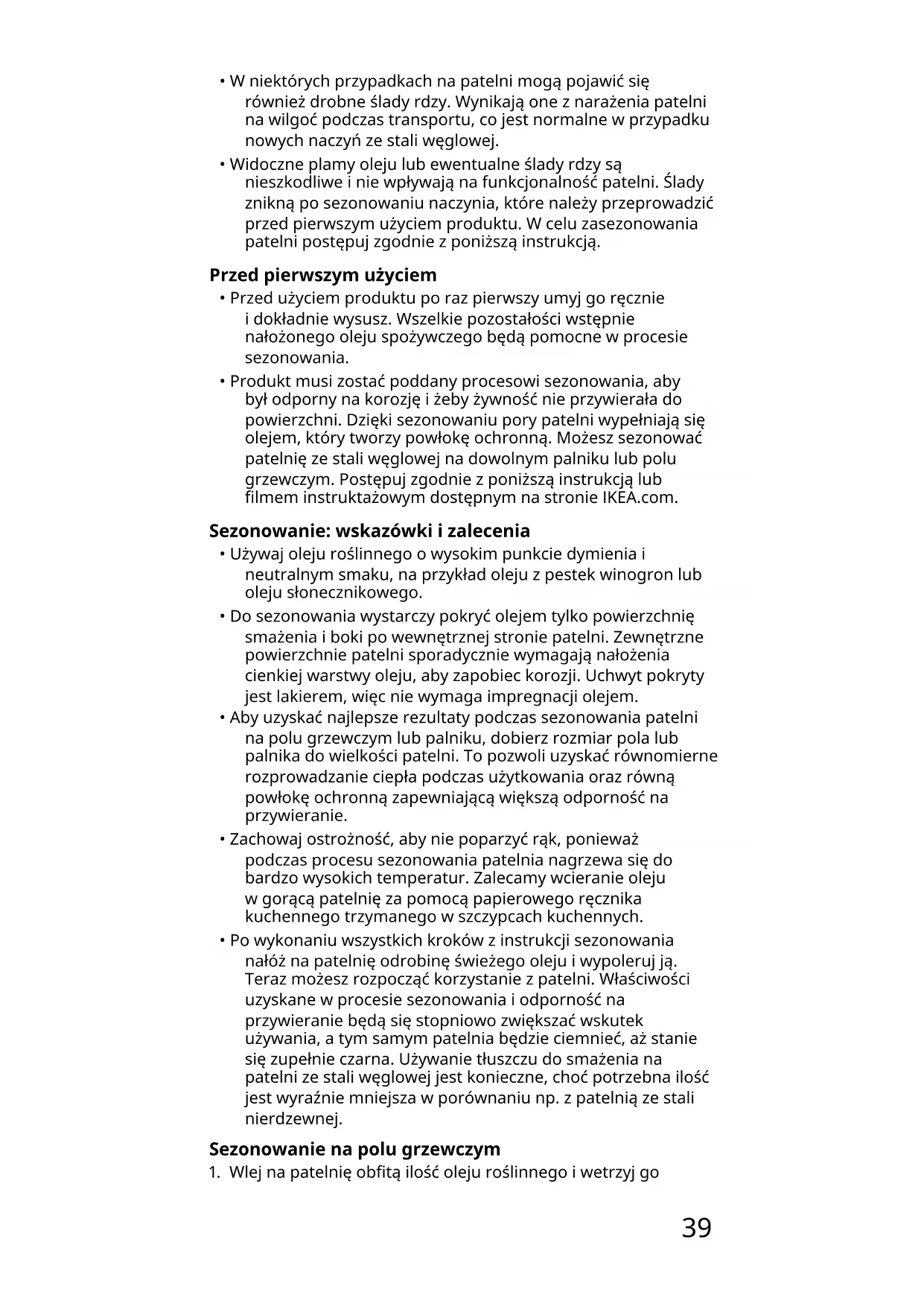- Produkt musi zostać poddany procesowi sezonowania, aby był odporny na korozję i żeby żywność nie przywierała do powierzchni. Dzięki sezonowaniu pory patelni wypełniają się olejem, który tworzy powłokę ochronną. Możesz sezonować patelnię ze stali węglowej na dowolnym palniku lub polu grzewczym. Postępuj zgodnie z poniższą instrukcją lub lmem instruktażowym dostępnym na stronie IKEA.com. Sezonowanie:wskazówkiizalecenia