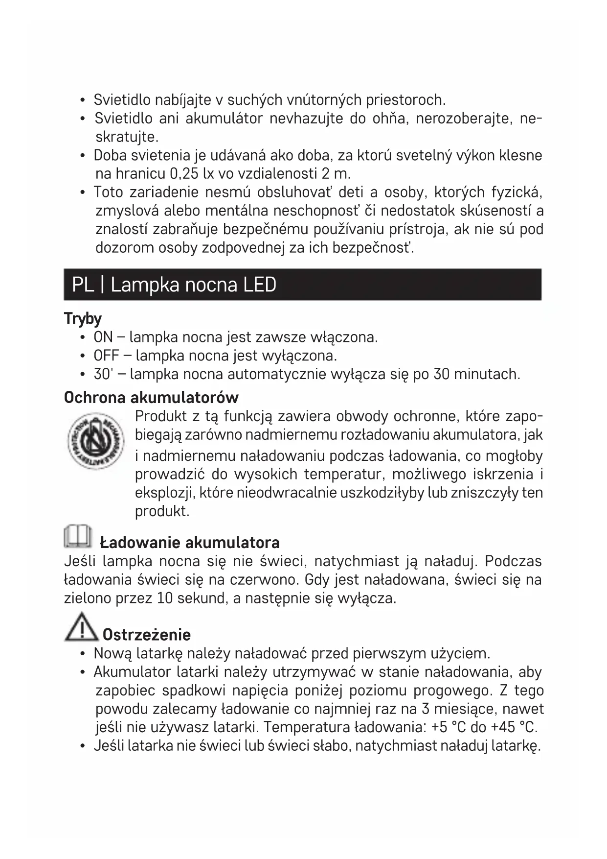 - 30' – lampka nocna automatycznie wyłącza się po 30 minutach. Ochrona akumulatorów Produkt z tą funkcją zawiera obwody ochronne, które zapo- biegają zarówno nadmiernemu rozładowaniu akumulatora, jak i nadmiernemu naładowaniu podczas ładowania, co mogłoby prowadzić do wysokich temperatur, możliwego iskrzenia i eksplozji, które nieodwracalnie uszkodziłyby lub zniszczyły ten produkt. Ładowanie akumulatora Jeśli lampka nocna się nie świeci, natychmiast ją naładuj. Podczas ładowania świeci się na czerwono. Gdy jest naładowana, świeci się na zielono przez 10 sekund, a następnie się wyłącza. Ostrzeżenie